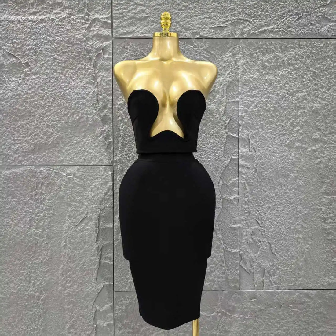 Women Sexy Strapless 2 Pieces Bodycon Rayon Bandage Midi Dress Nightclub Party Fashion Birthday Dress
