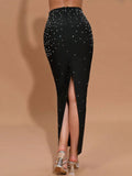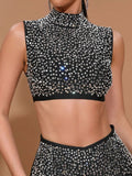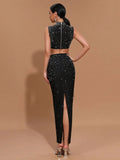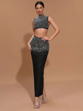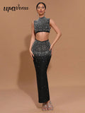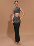 2025 Sexy Women'S Light Luxury Hot Stamping Design Long Skirt Bandage Set O-Neck Sleeveless Ultra Short Top+Skirt Two-Piece Set