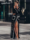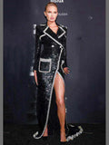Celebrity Evening Cocktail Party Maxi Dress Women Polo Neck Long Sleeve Double breasted Pocket Design Slim Fit Split Long Dress