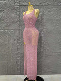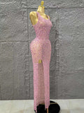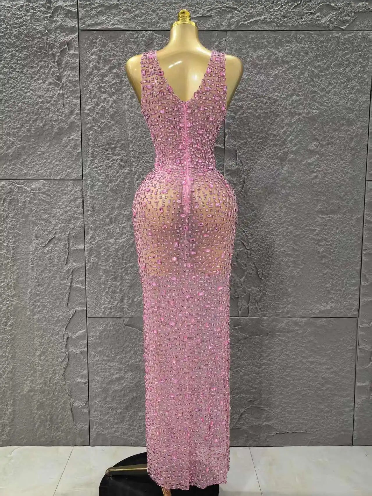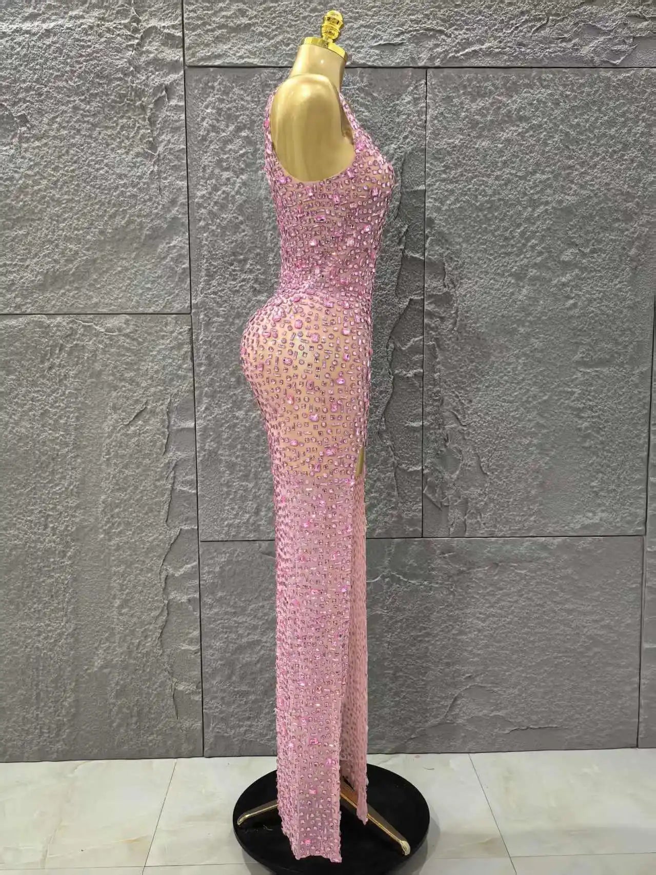 Handmake Top Quality Women Sleeveless Sexy O-Neck Mesh See Through Full Crystal Bodycon Long Dress Birthday Party Stage Wear