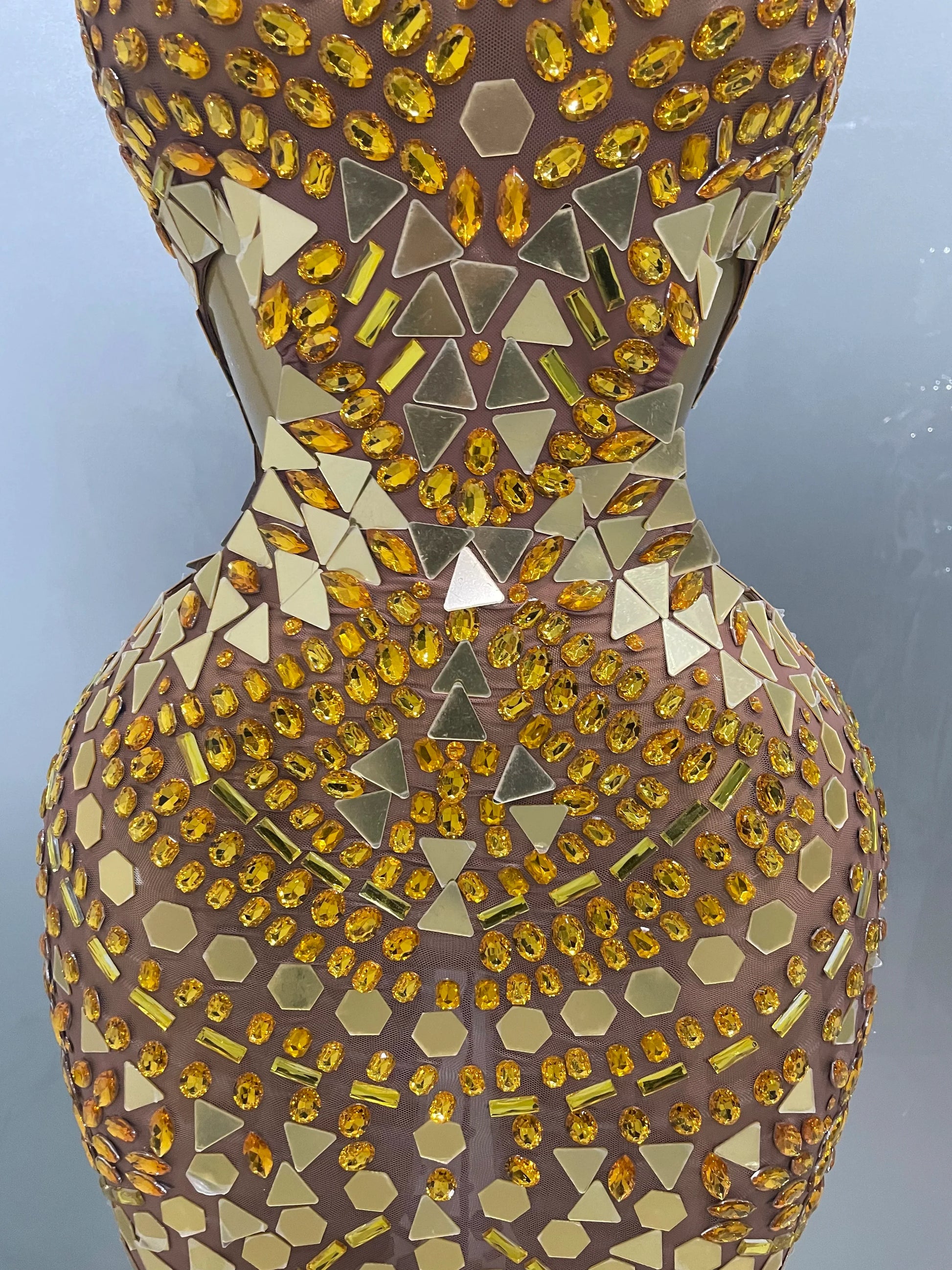 Luxury Shiny Mirror Rhinestones Hollowed-out Long Dress Women Celebrity Evening Party Catwalk Prom Stage Photo Shoot Dresses