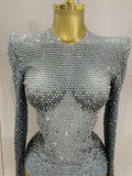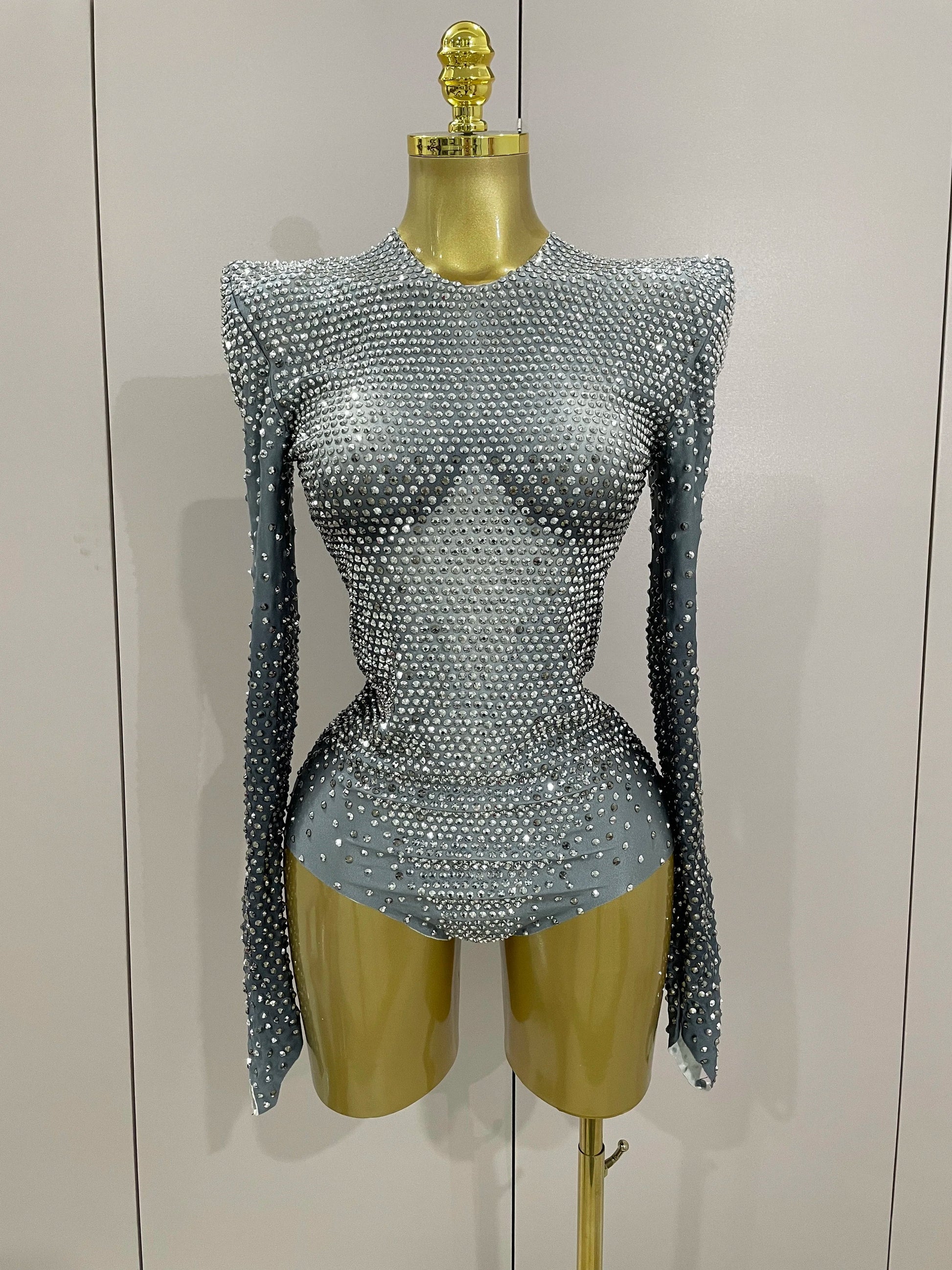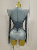 Sparkle Silver Rhinestones Long Sleeve Stretch Bodysuits New Women Evening Luxury Birthday Party Sexy Nightclub Stage Costu