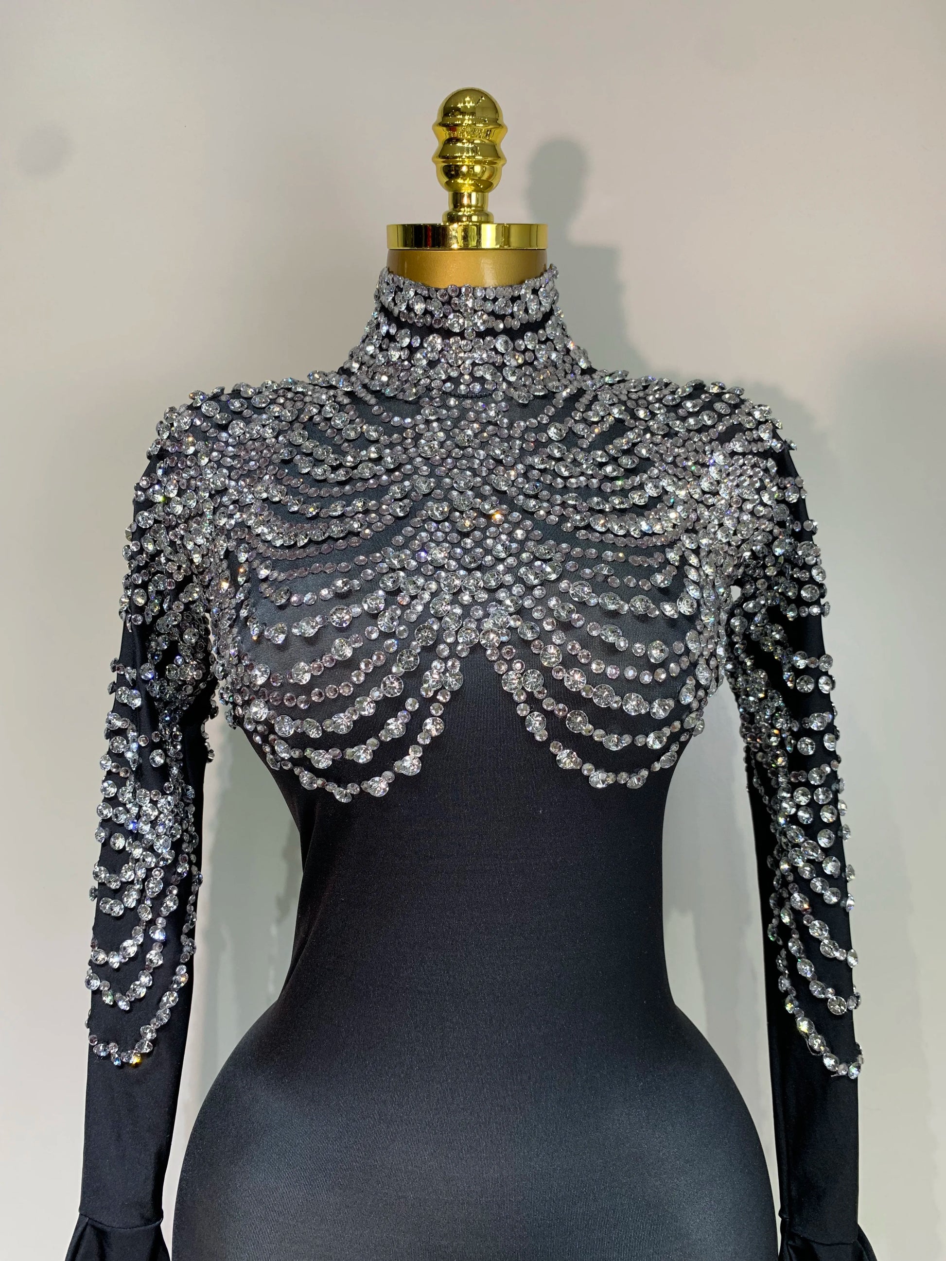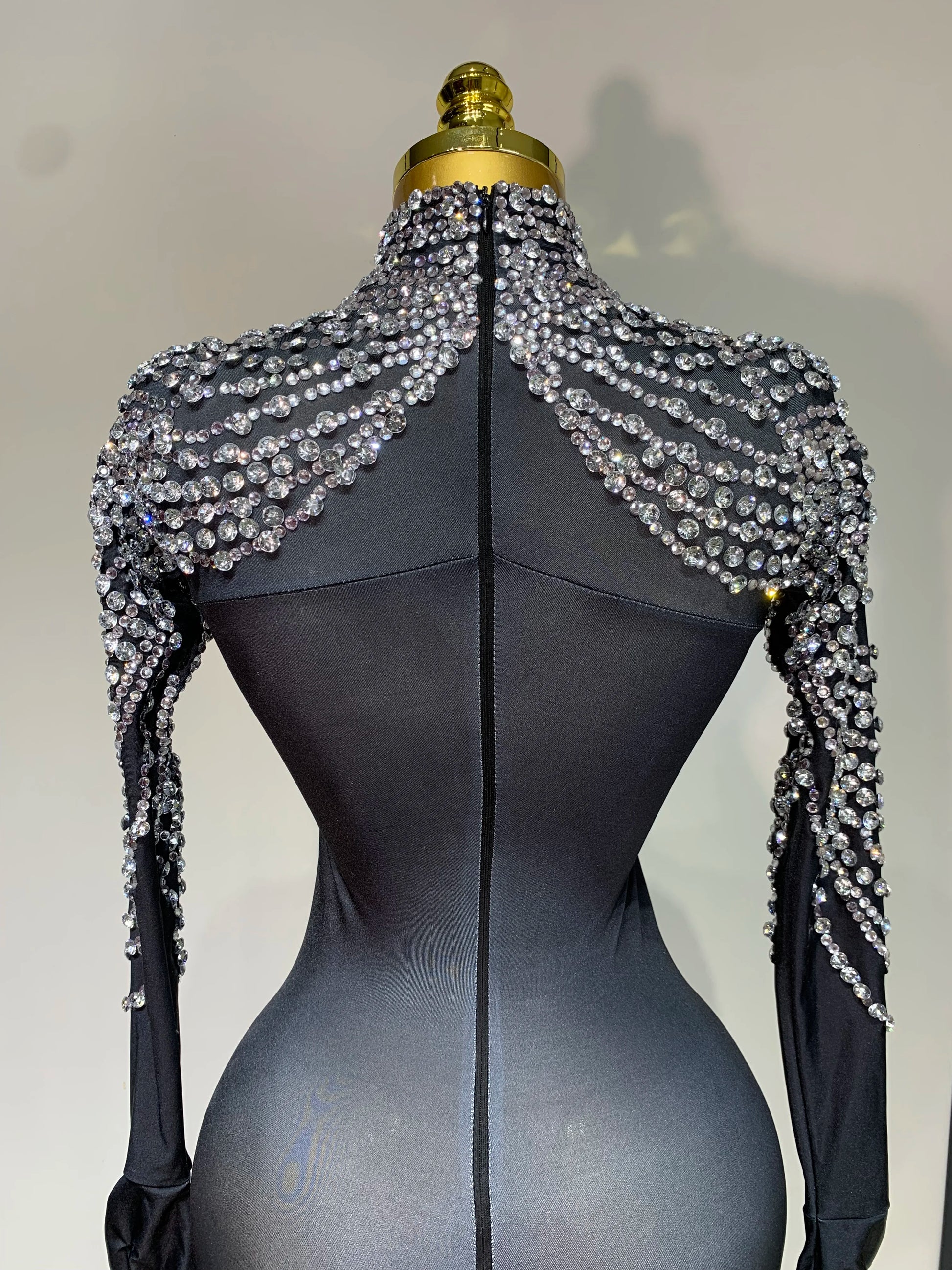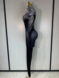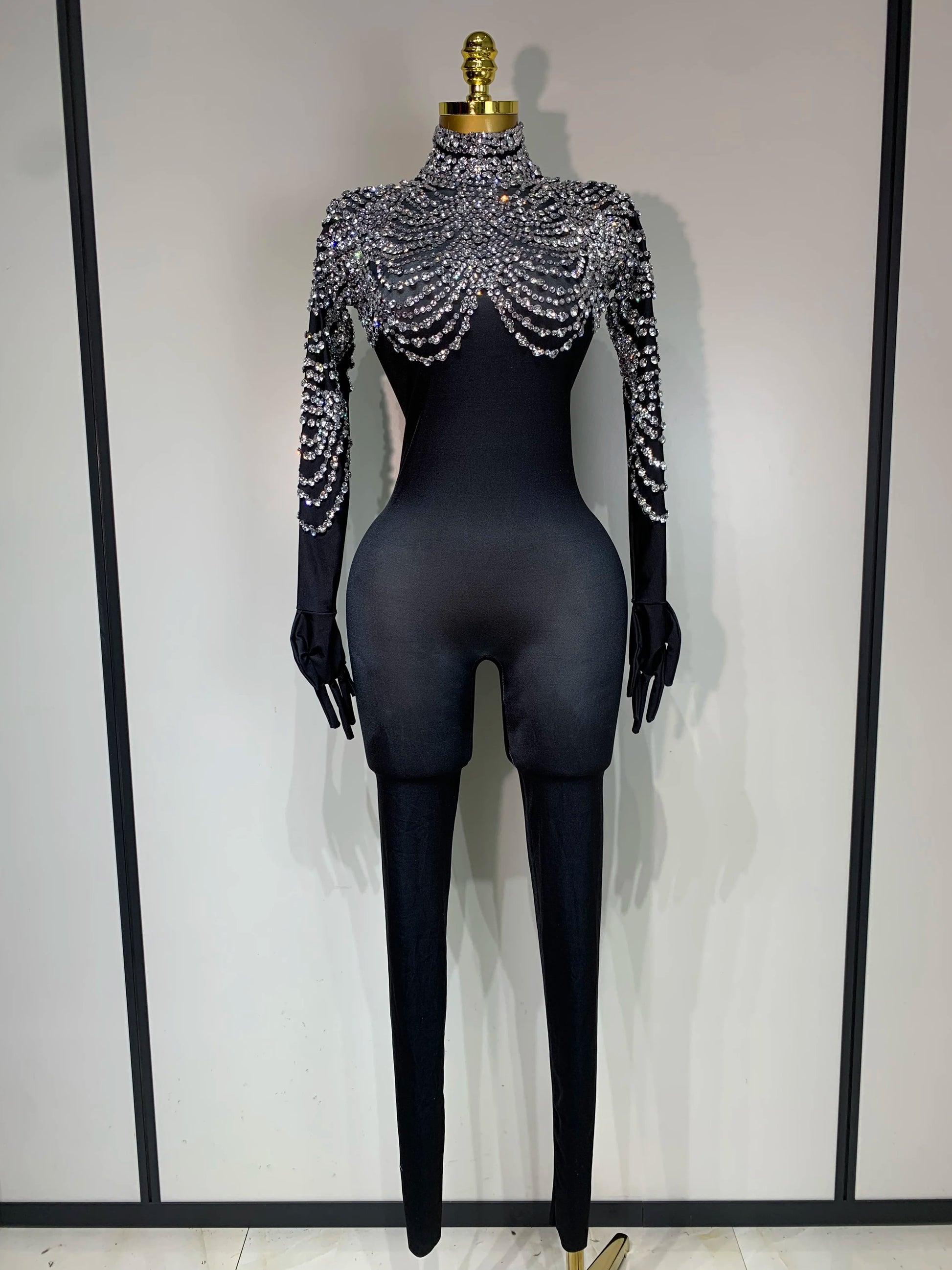 Stock Women Sexy Nightclub Evening Party Drag Queen Singer Dancer Stage Performance Costume Luxury Rhinestone Stretch Jumpsuit