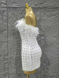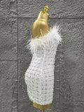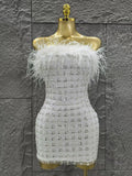 White Color Women Shinning Sequins Straples Bodycon Mini Dress Feathers Fashion Celebrate Birthday Party Cute Cocktail Dress