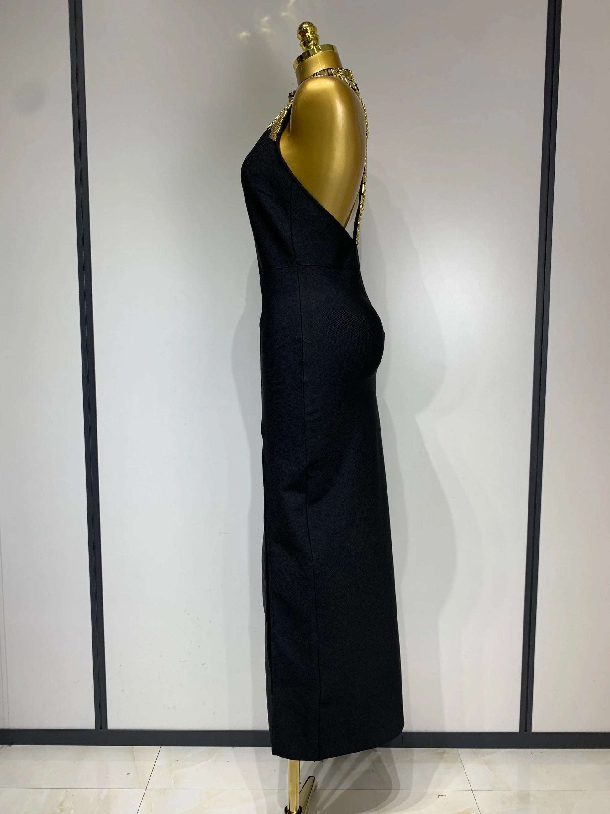 Women Fashion Celebrity Sexy Backless Beading Midi Black Bodycon Bandage Dress Elegant Evening Club Luxury Birthday Dresses
