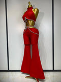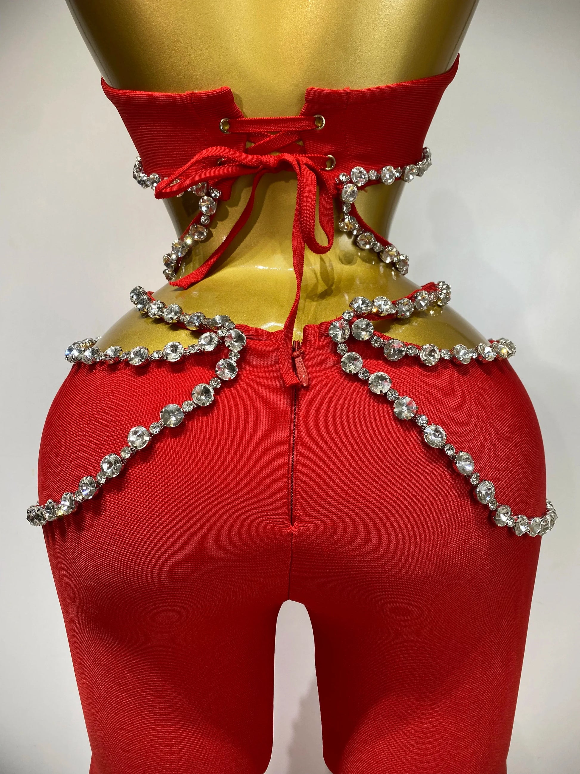 Women Luxury Rhinestone Red Sexy Cut Out Two Piece Pants Bandage Set Celebrity Designer Fashion Women's Set Stage Outfit