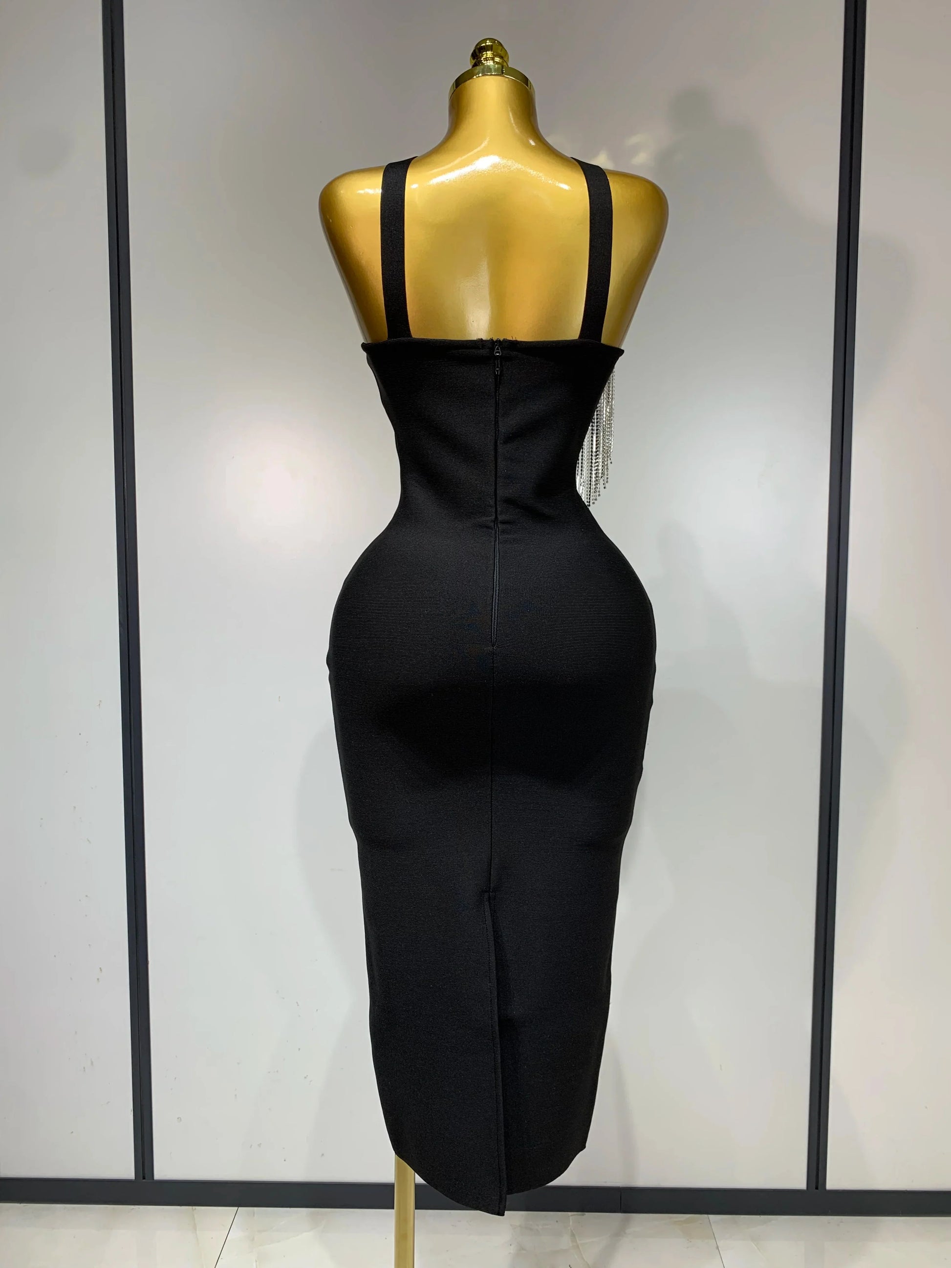 Women Sexy Diamonds Tassel Crystal Midi Black Bodycon Bandage Dress Elegant Evening Party Luxury Birthday Dresses Vestido