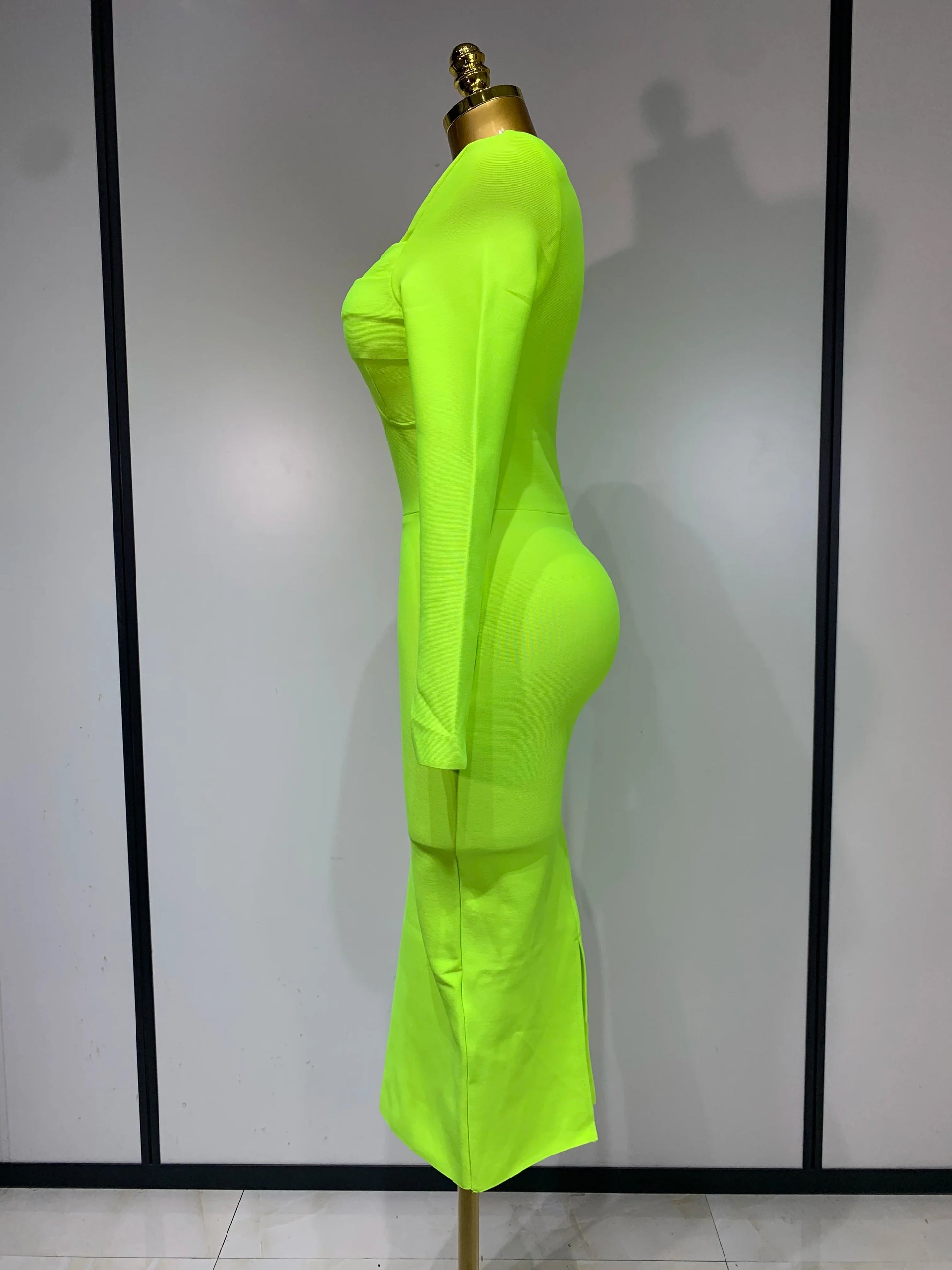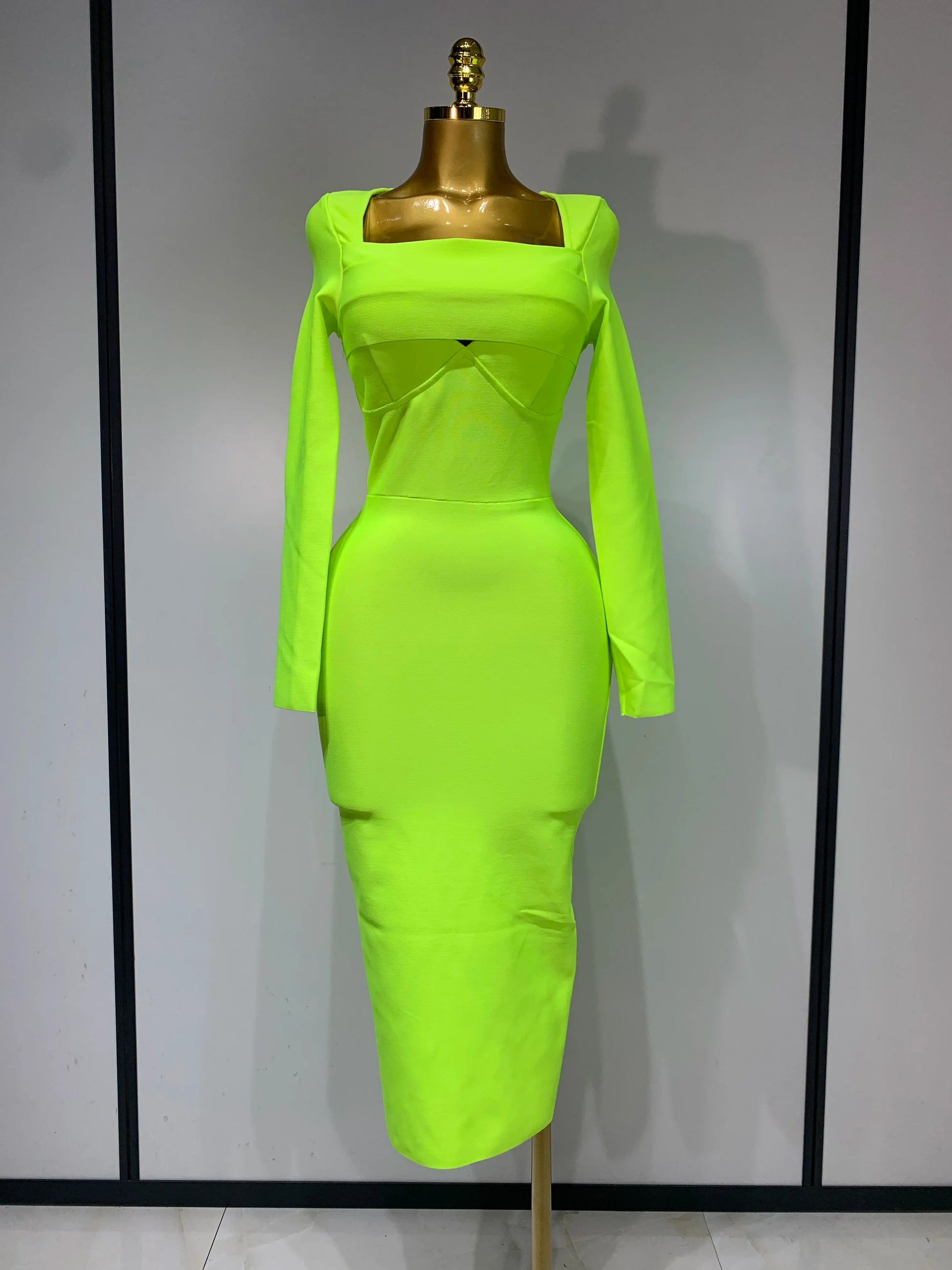Women Sexy Long Sleeve Square Collar Fluorescent Green Midi Bodycon Bandage Dress Elegant Evening Birthday Party Dresses
