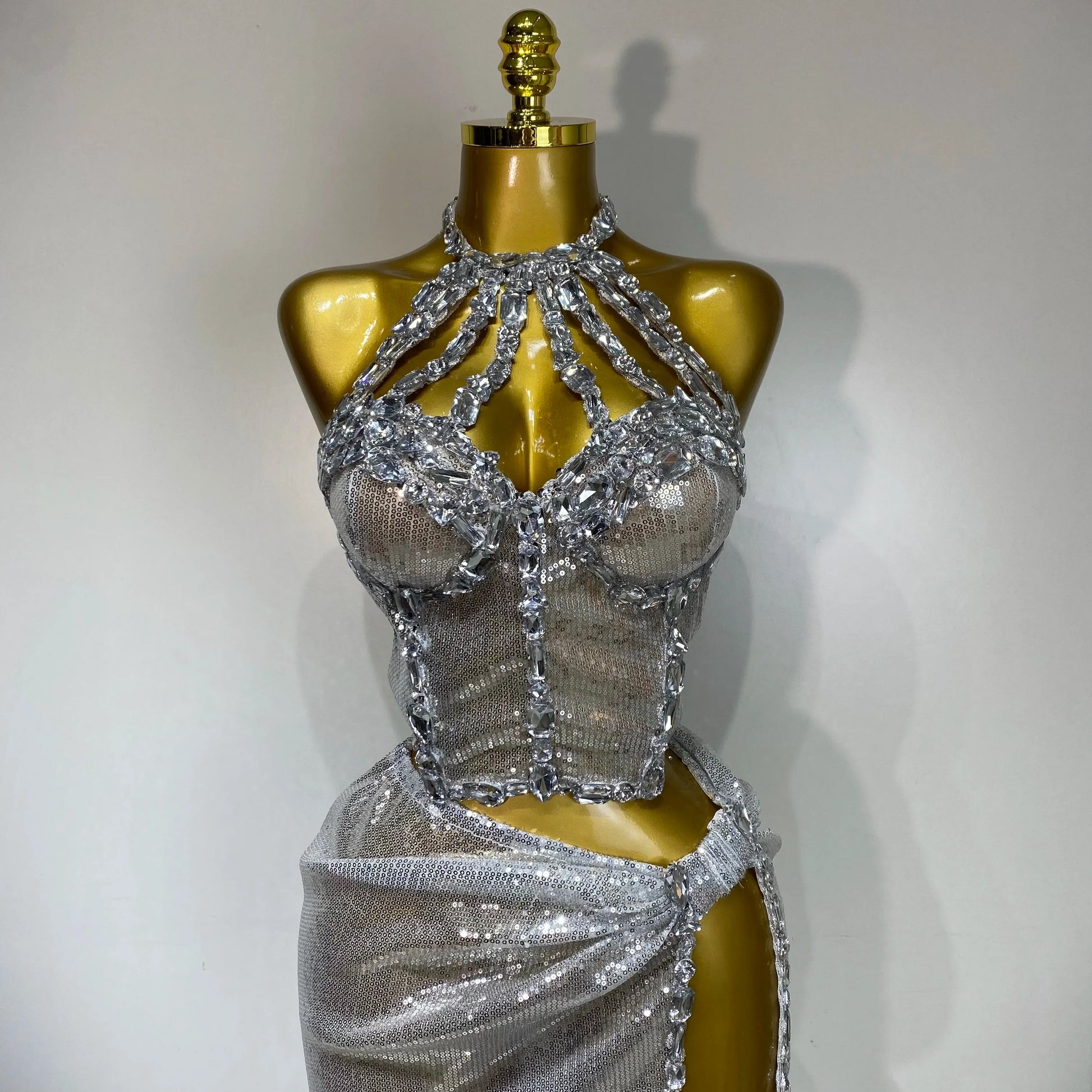 Women Sparkly Silver Rhinestones Top Long Skirt Two Pieces Set Singer Dancer Performance Costume Nightclub Stage Wear
