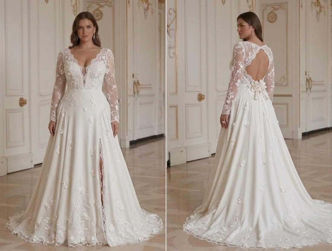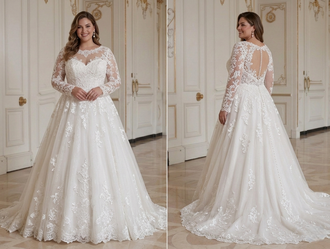 Elegant Wedding Dress For Curvy Bride With Lace Applique Detail