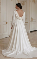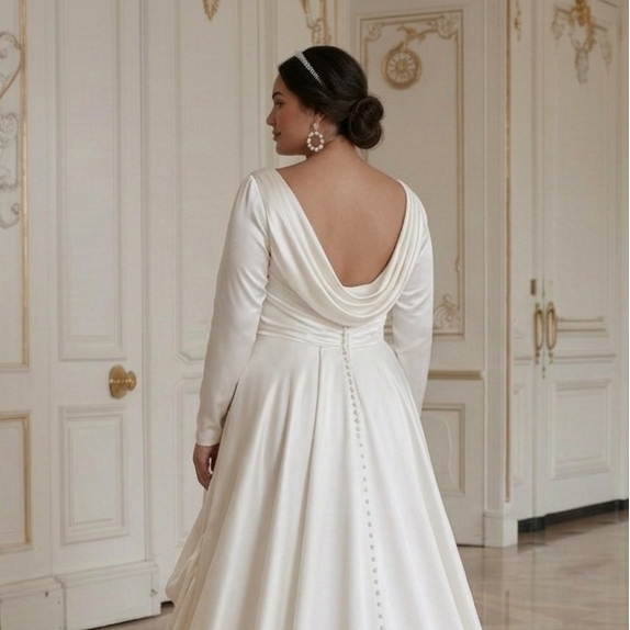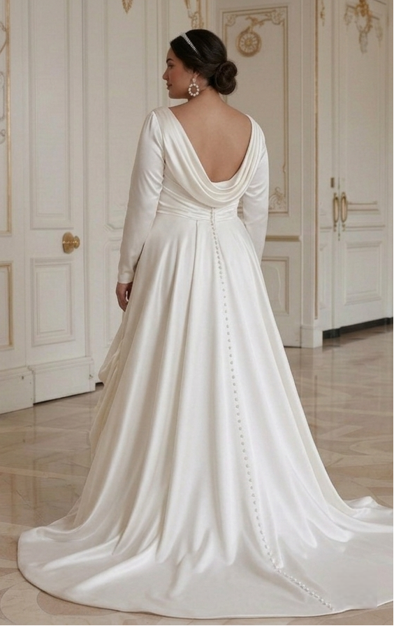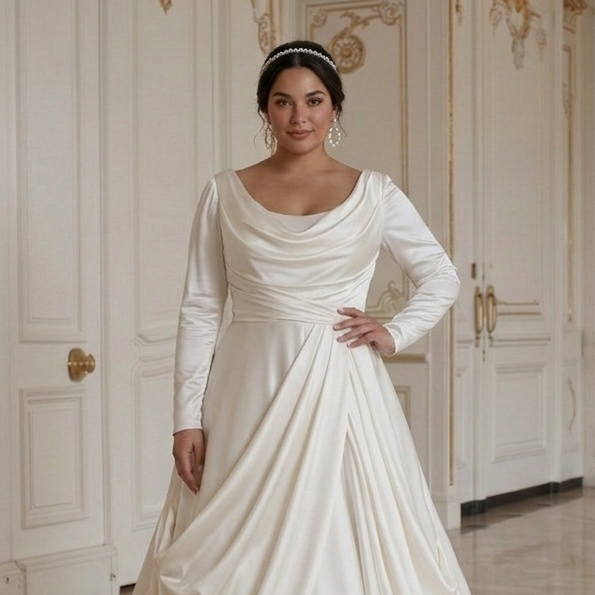 Elegantes Brautkleid für kurvige Braut, weicher, drapierter Satin-Stil