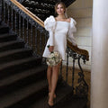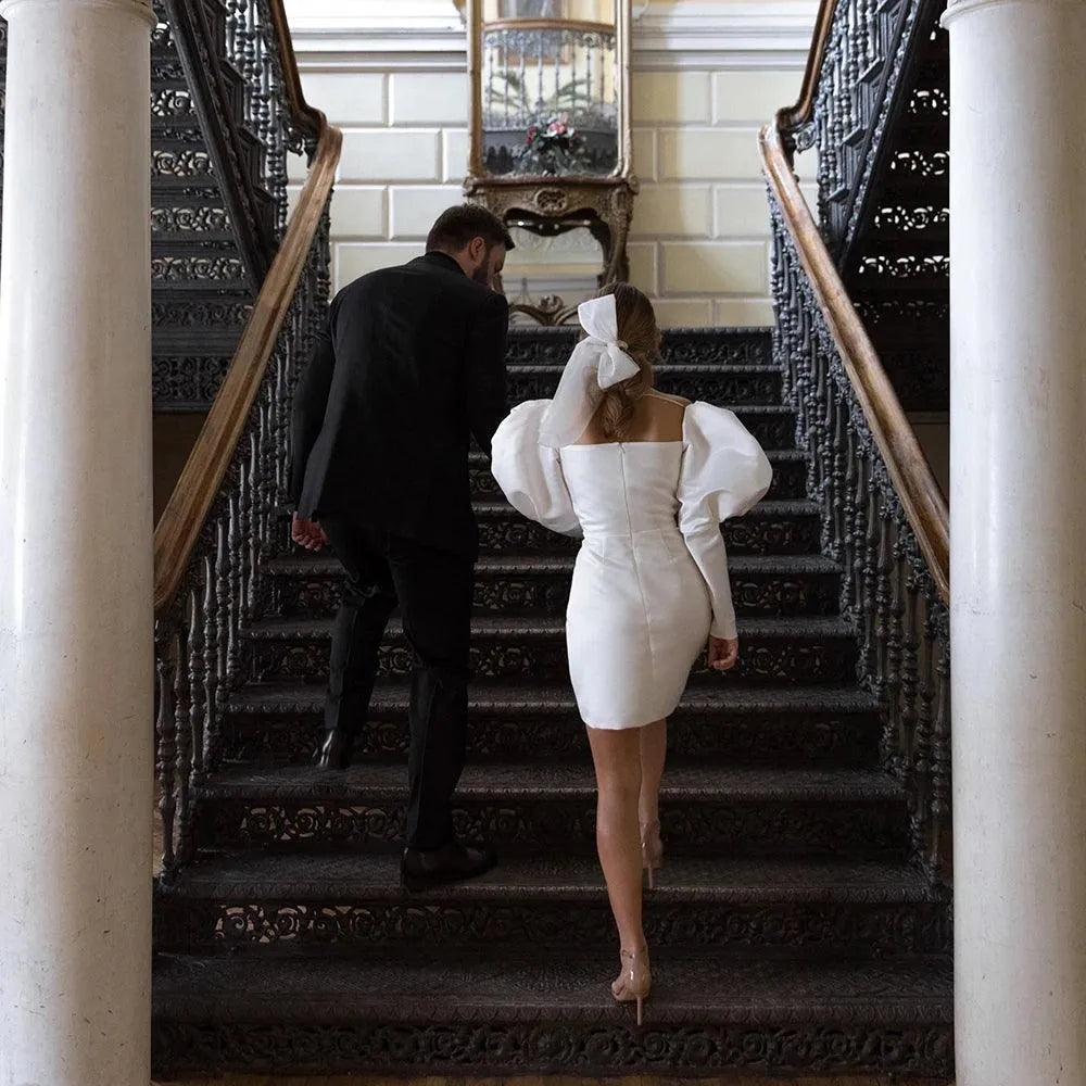 Lange Blasenärmel Satin Micro Big Size Brautkleid Drop Ship Maßgeschneiderte Einfache Minilänge über dem Knie Elfenbein Brautkleider