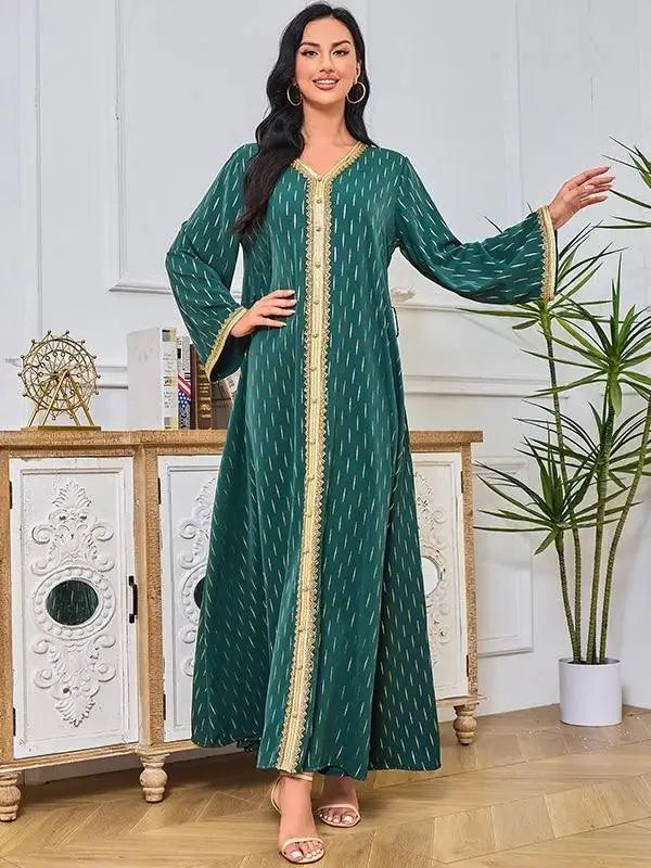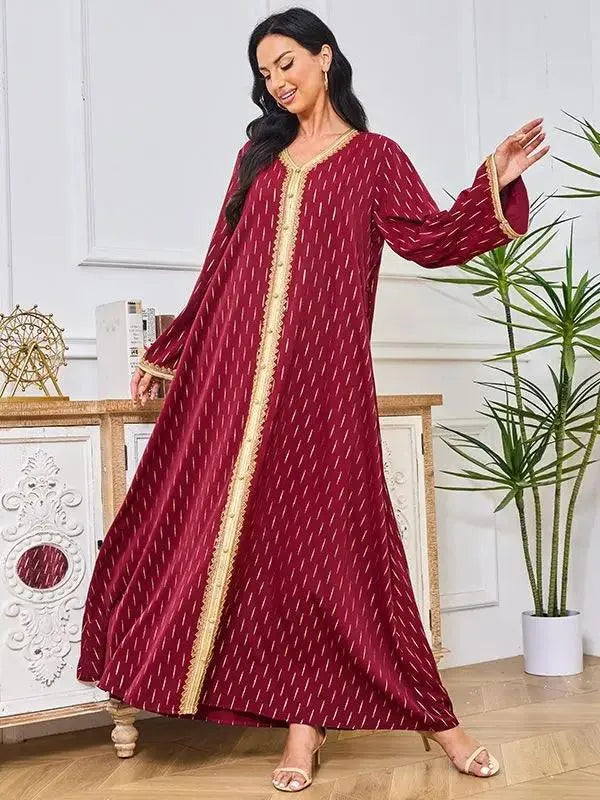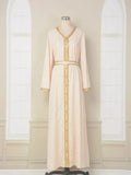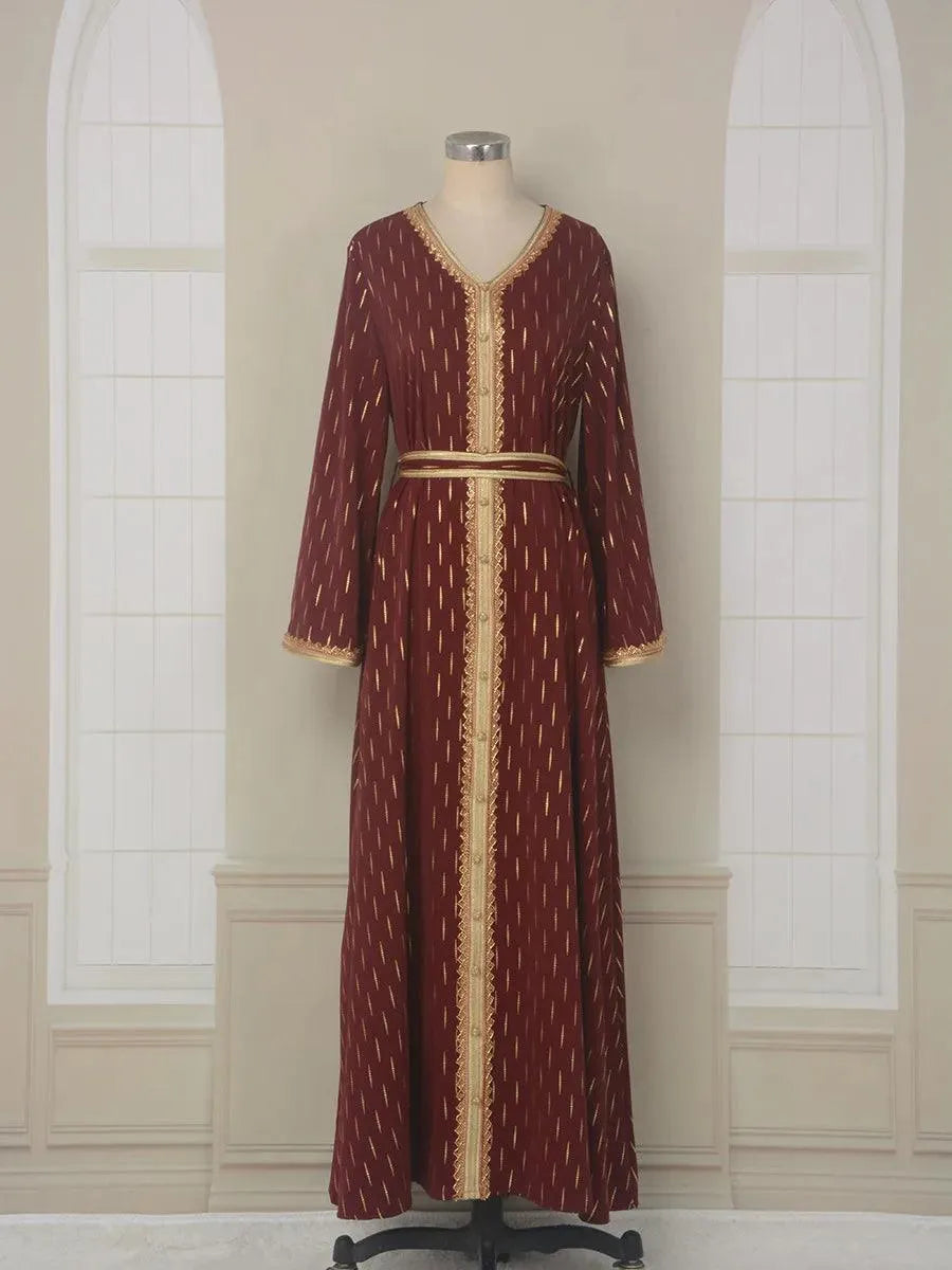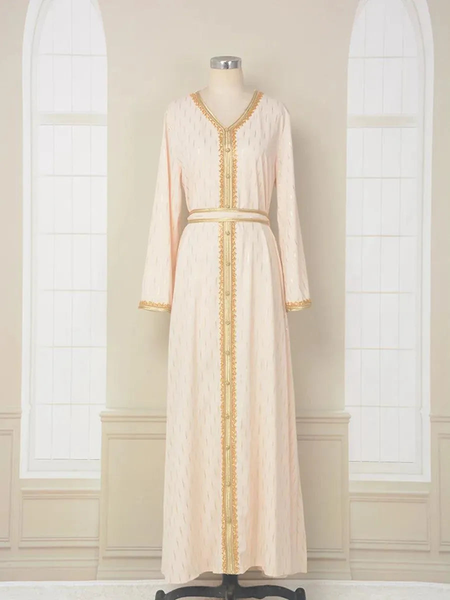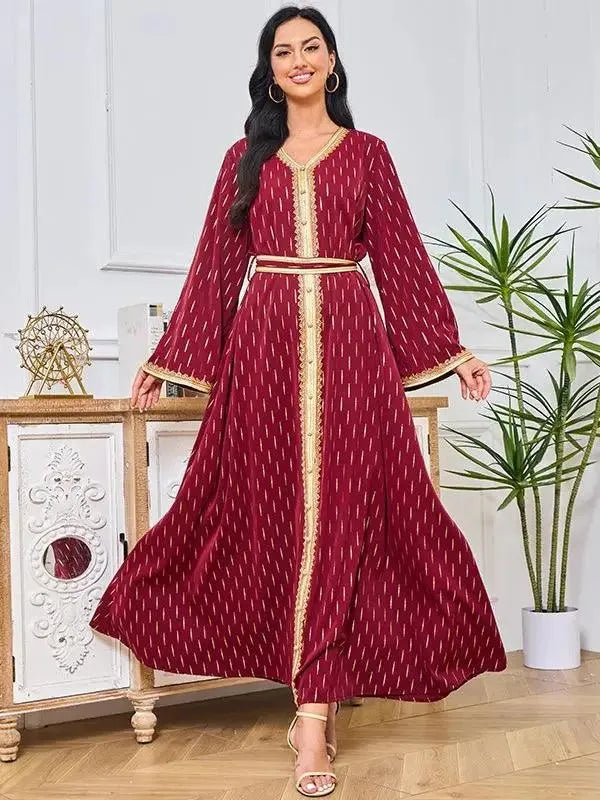 Abaya Muslim Fashion Chic Tape Trim Volle Ärmel V-Ausschnitt Gürtel Kleidung Elegante Casual Afrikanische Lange Kleider Für Frauen