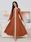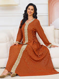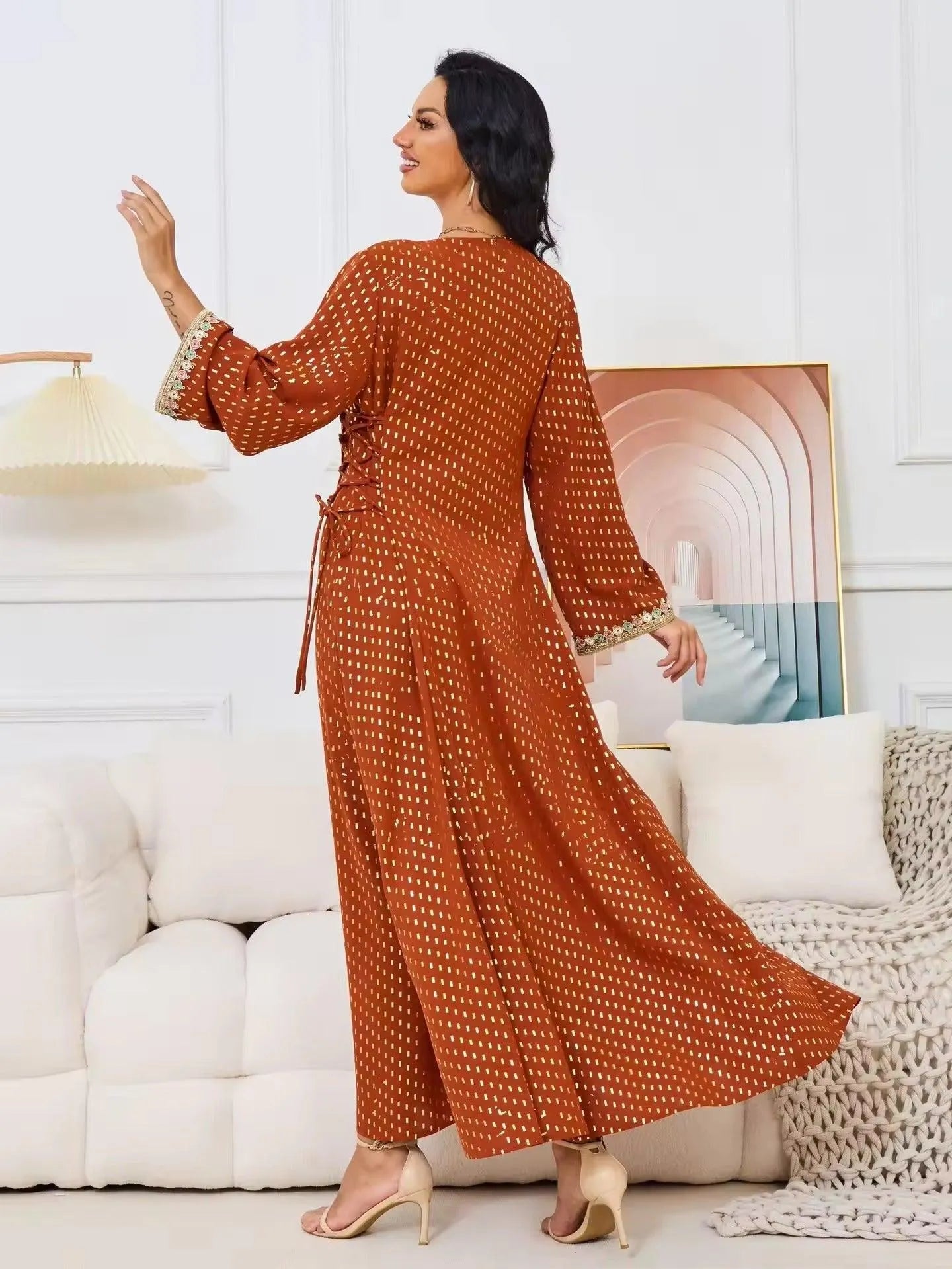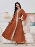 Mode Goldprägung Gürtel Abaya Dubai Islamische Kleidung Bandbesatz Langarm V-Ausschnitt Elegantes Damenkleid Arabischer Kaftan