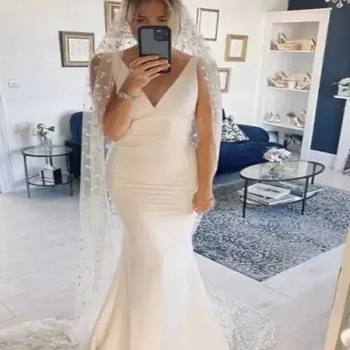 Tiefer V-Ausschnitt, abnehmbare Schleppe aus Krepp, Meerjungfrau-Brautkleid, schlicht, ärmellos, offener Rücken, schlichte Brautkleider, elegant