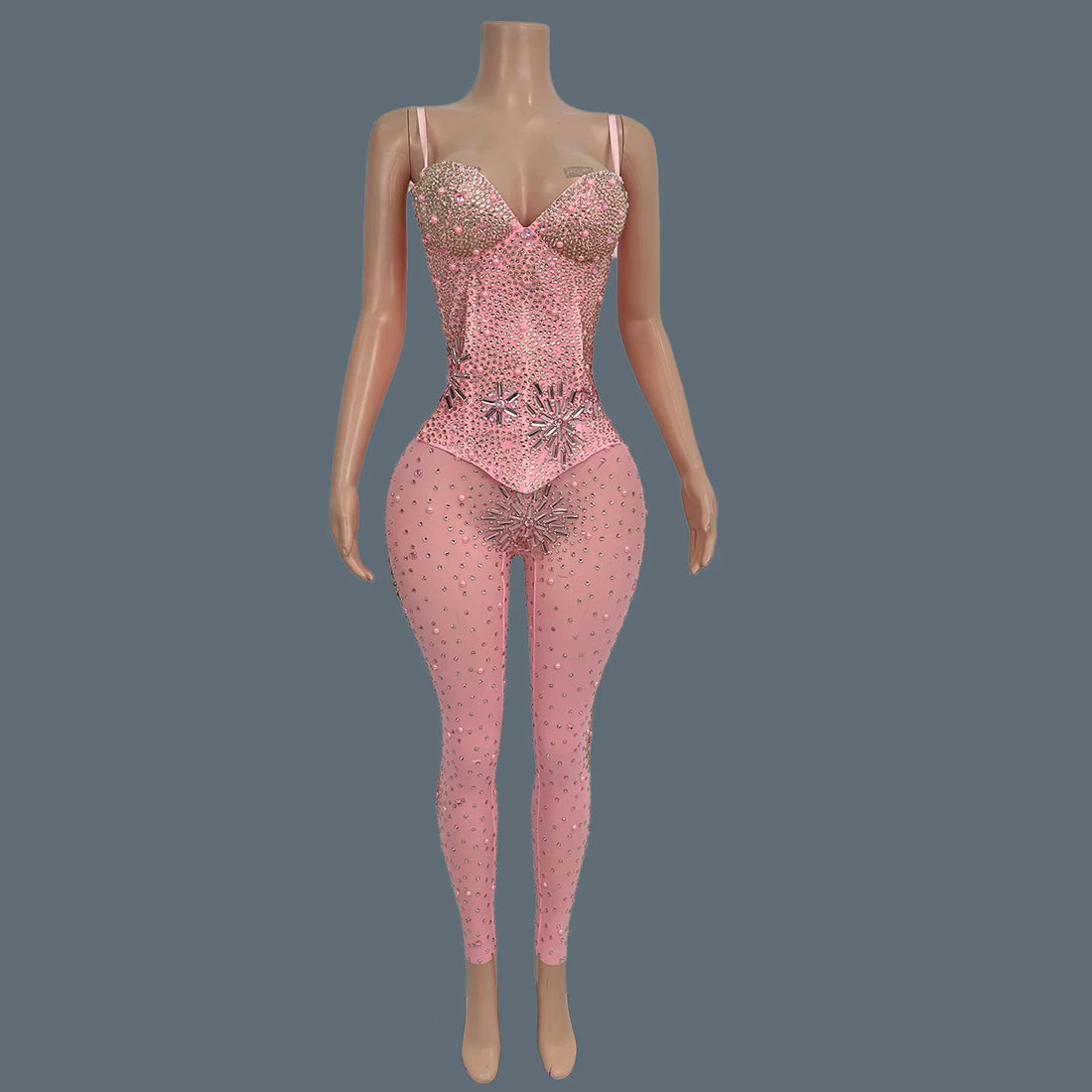 Sparkly Rhinestones Jumpsuit Gloves for Women Sexy Stretchy Performance Dance Costume Nightclub Jumpsuit Show Stage Wear Dudou
