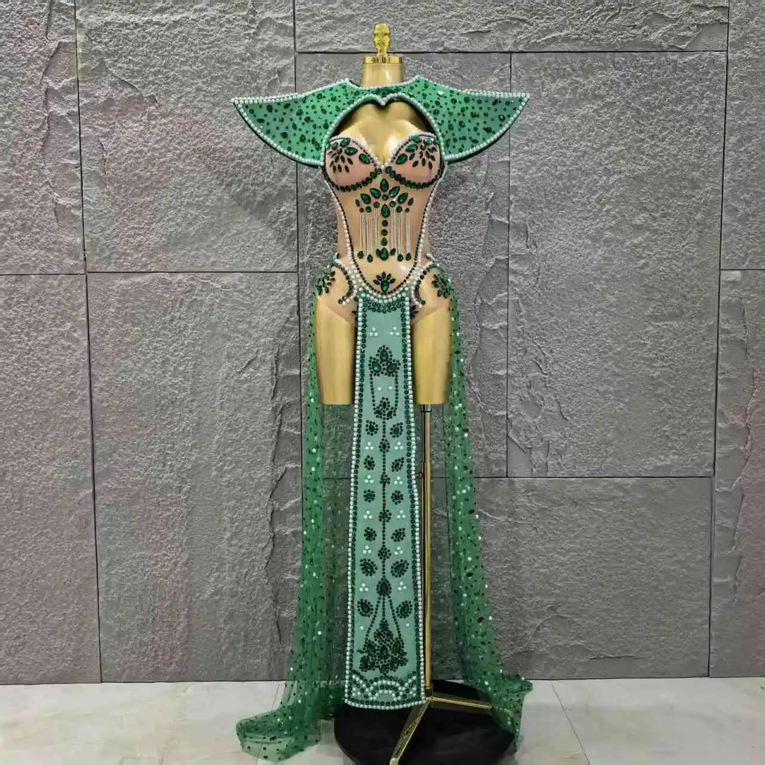 Top Quality Women Sexy Green Color Bodysuit 4 Pieces Set Celebrate Nightclub Party Bar Dancer Performance Costume Stage Wear