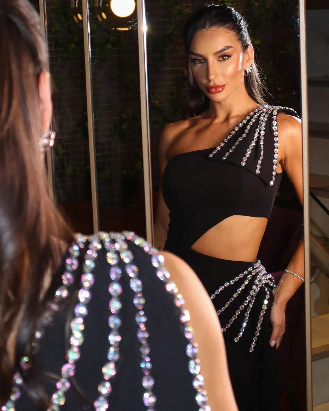 2025 Women Sexy One Shoulder Big Crystal Bodycon Bandage Long Dress Celebrate Elegant Evening Party Outfit Vestido