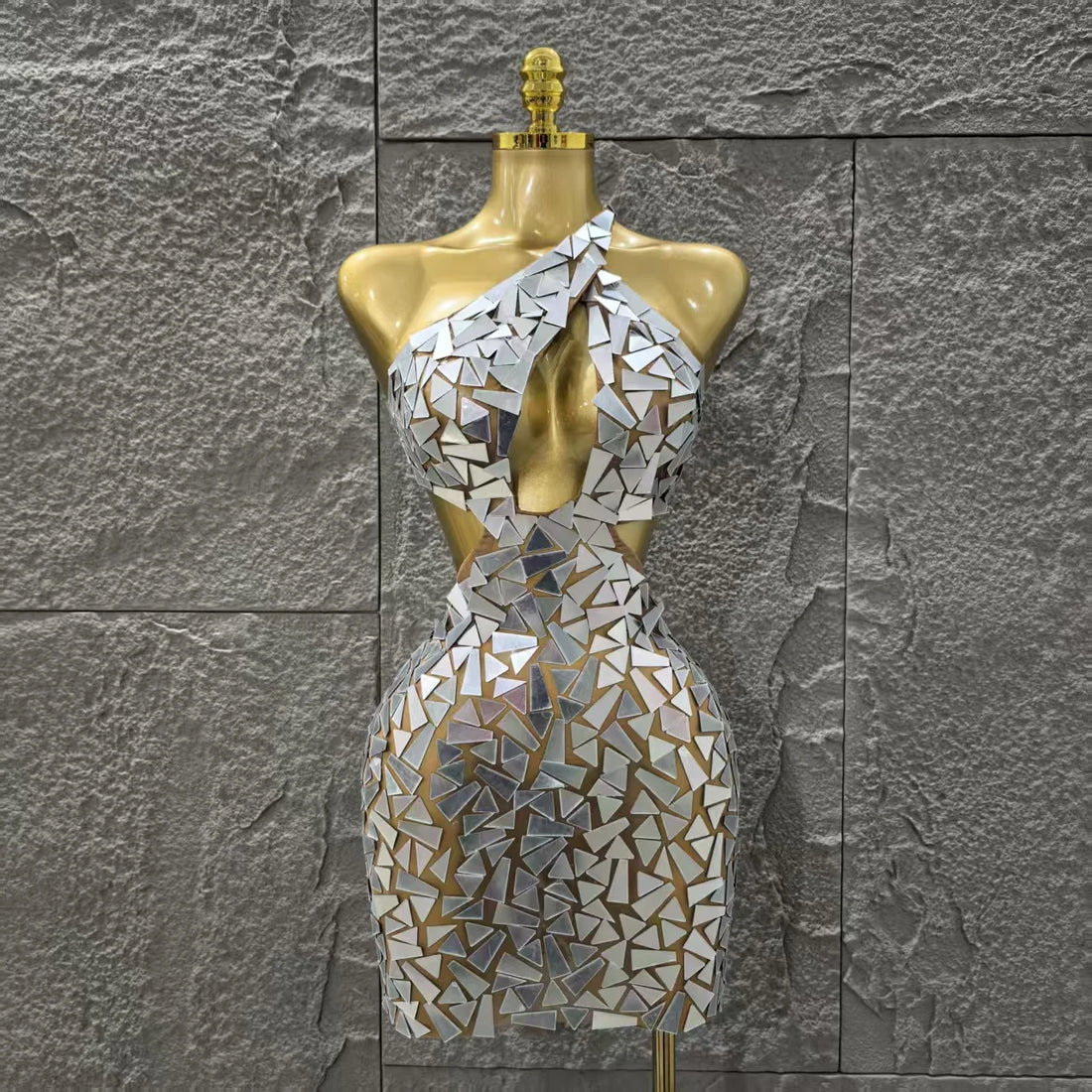 Silver Color Women Sexy One Shoulder Shinning Mirrors Bodycon Mini Dress Nightclub Party Celebrate Birthday Photo Shoot Dress