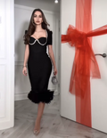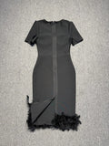 Black Color Women Sexy Short Sleeve Square Collar Feathers Bodycon Mid-calf Bandage Dress Celebrate Nightclub Party Fashion Wear