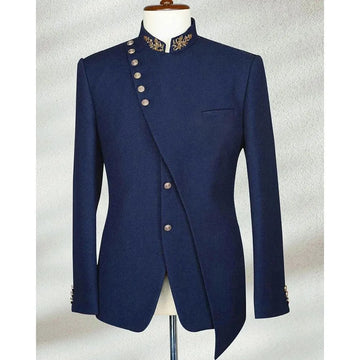 Blazer Trajes de Hombre Azul Marino Traje Hombre Chaqueta Una Pieza Cuello Alto Elegante Formal Ocasión Largo Regular Corte Entallado