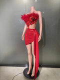 Christmas Style Women Sexy 2 Pieces Beading Draped Bodycon Mini Dress Nightclub Party Celebrate Bar Singer Performance Costume