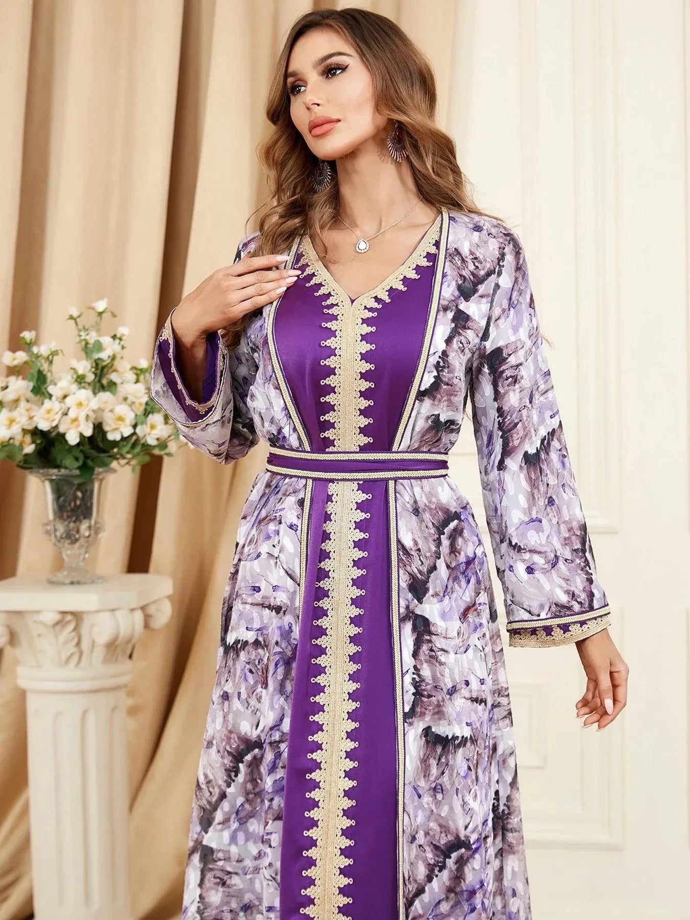 Conjunto de 2 piezas de abaya musulmana de satén con estampado elegante, manga larga, cuello en V y cinturón, caftán marroquí, ropa islámica para Ramadán