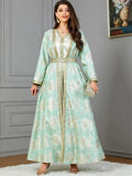 Conjunto de caftán musulmán árabe de otoño e invierno con cuello en V, manga larga y cinturón de jacquard para mujer, estilo marroquí, africano y del Golfo, para Ramadán y Eid.