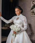 Elegante vestido de novia de sirena con encaje, cuello alto, talla grande, cola desmontable, manga larga, estilo árabe