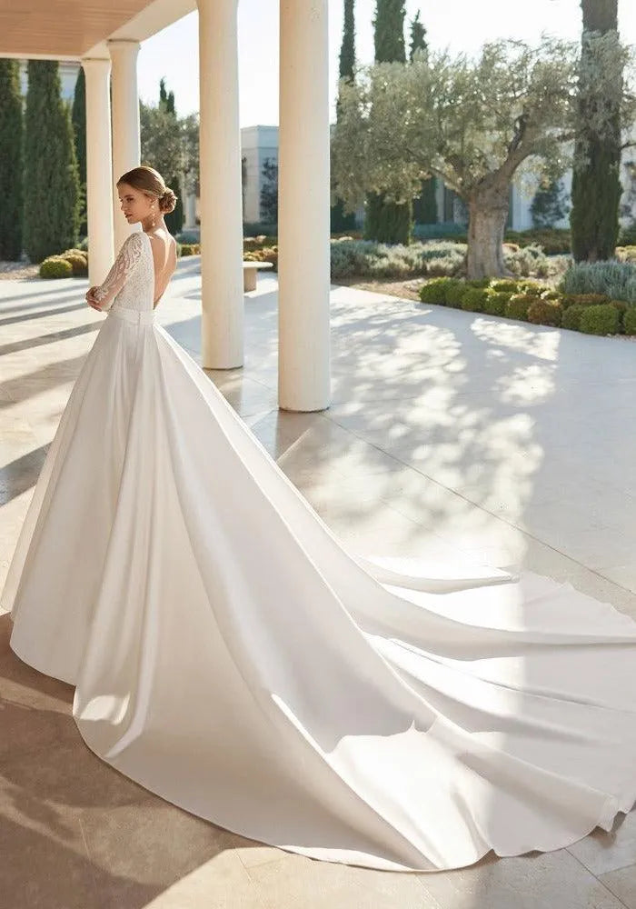 Hermosos vestidos de novia de satén fascinantes, hermosos vestidos de novia sencillos y elegantes de manga larga, bata sexy con apliques de encaje exquisitos.