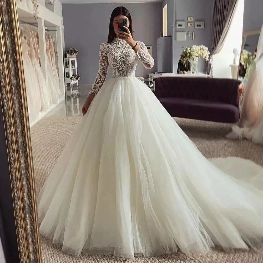 Hermoso vestido de novia romántico de manga larga con cuello alto, apliques de encaje y esponjoso.