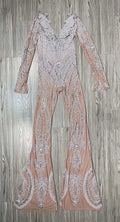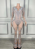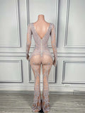 High-quality Pearls Rhinestones Mesh Bell-bottoms Lady Party Celebrate Birthday Stage Wear Luxurious Sexy Jumpsuit Shuangjiang