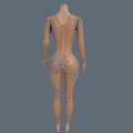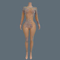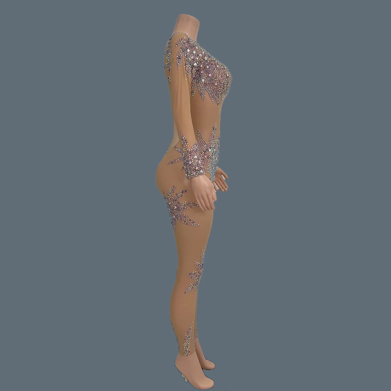 Sexy Transparent Tight Jumpsuit Women High Street Purple Performance Dancer Costume Mesh Diamonds Show Stage Rompers Ziluolan
