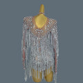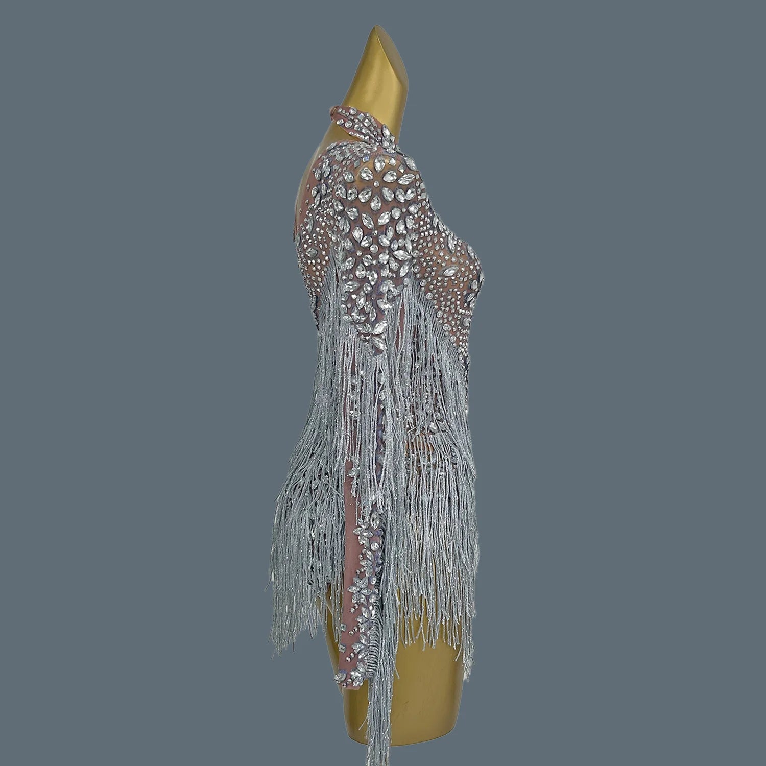 Shining Silver Tight Bodysuit Performance Dancer Costume Women Sexy Mesh Stretch Sequins Fringes Nightclub Stage Outfit Shenhui