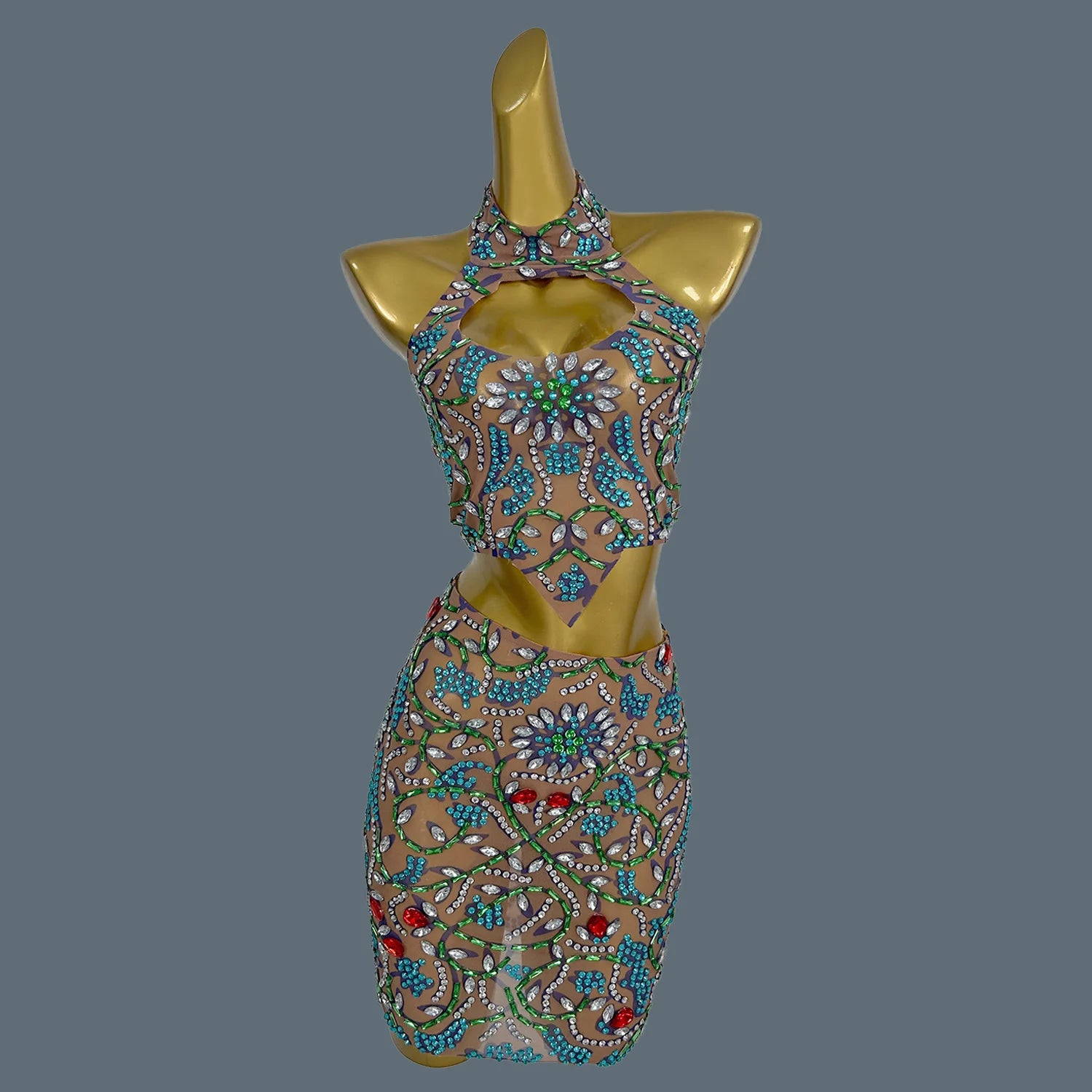 Sparkly Diamond Sexy Crop Top Skirt Set Backless DJ Club Stage Show Two Piece Sets Women Outfit Nightclub Party Dress Huacong