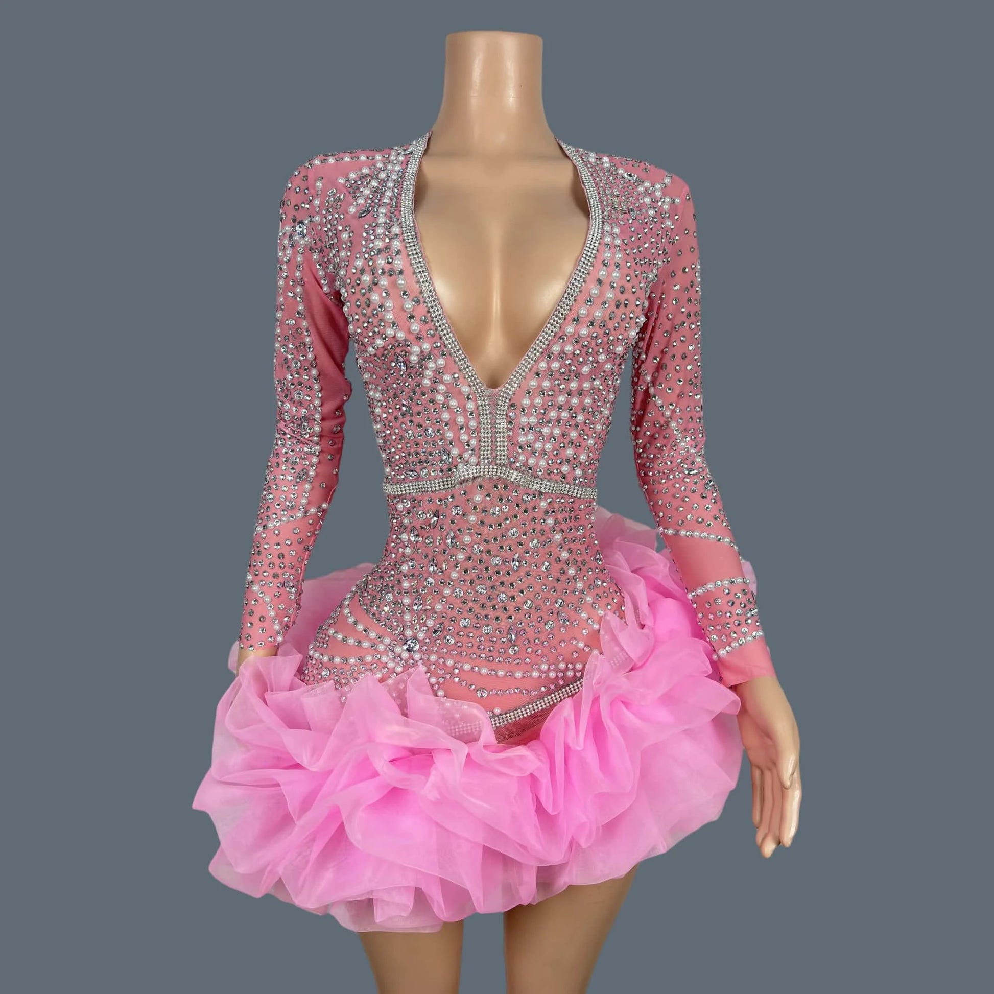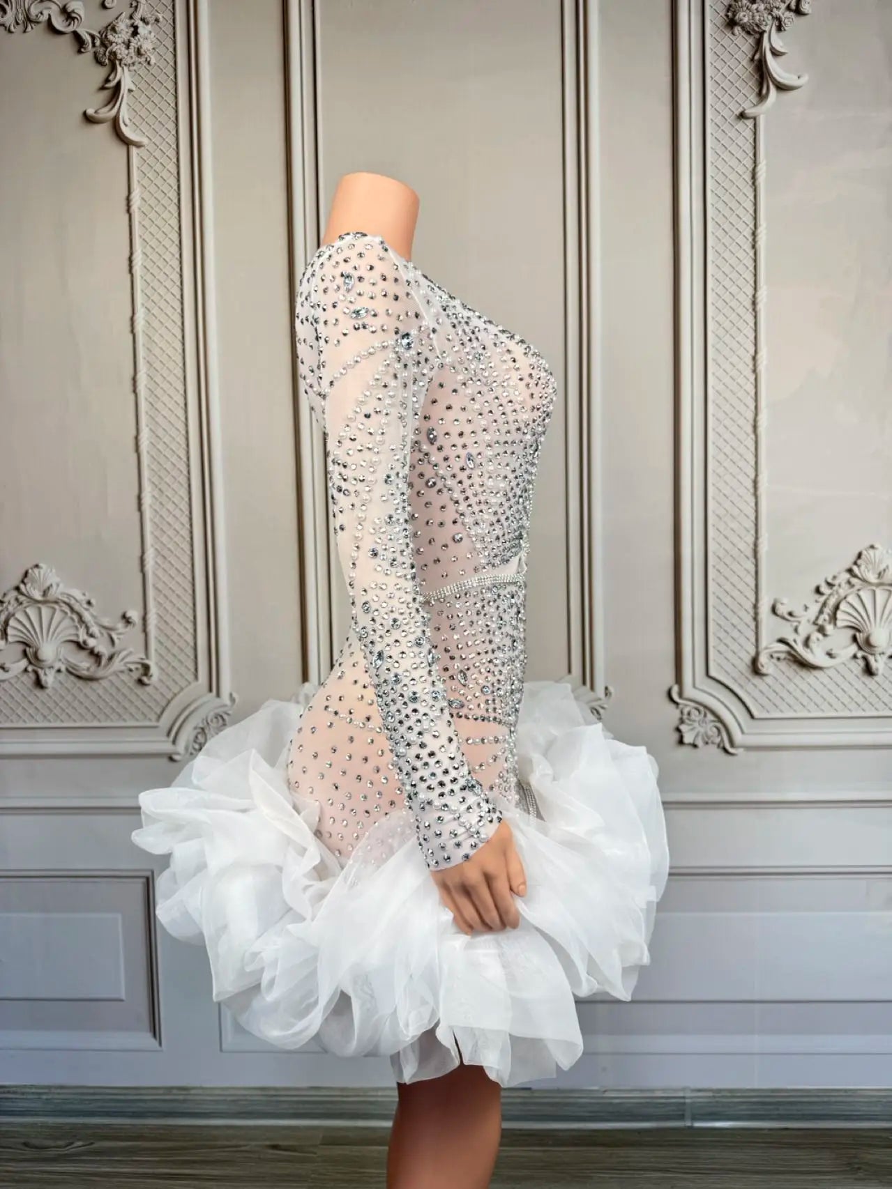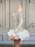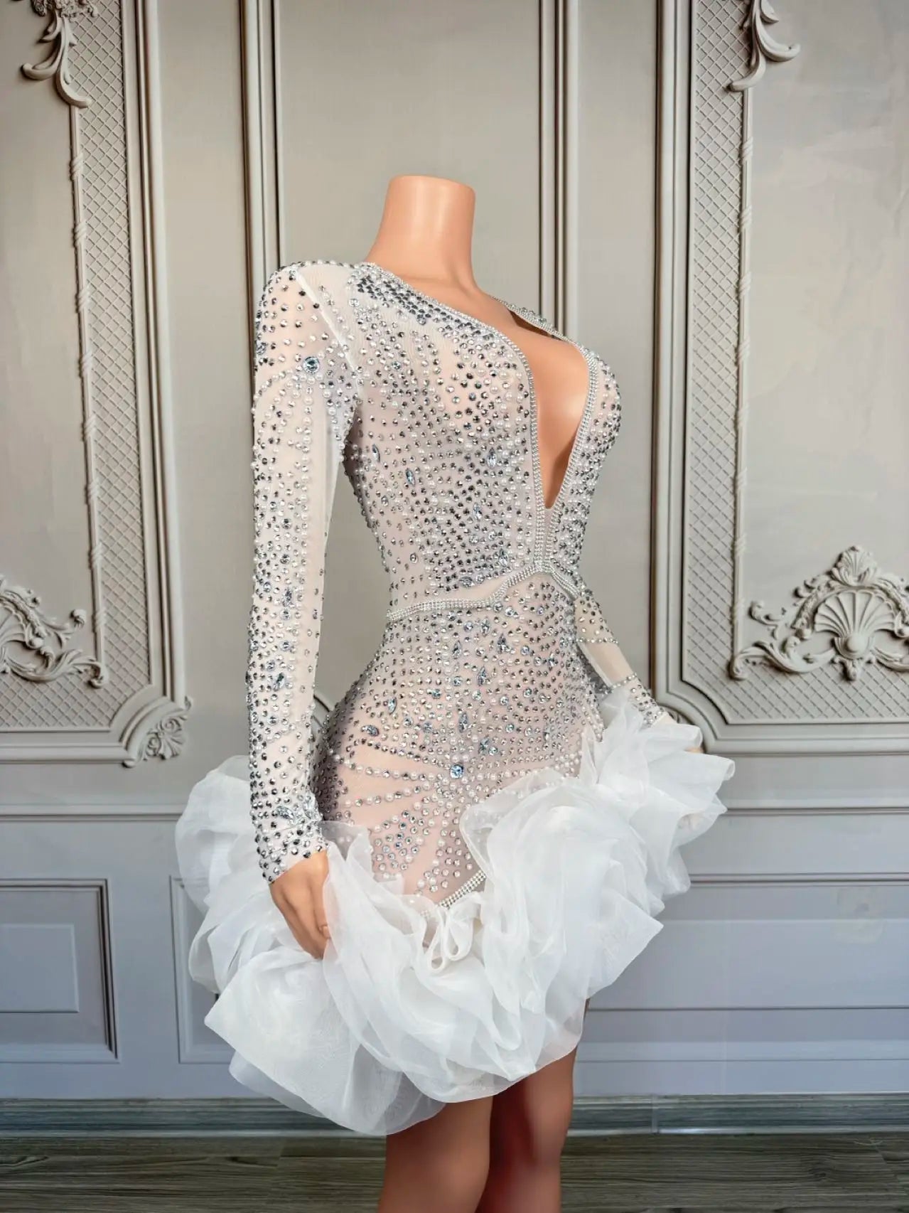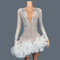 Sparkly Rhinestone White Pearls High-end Short Dress Sexy Women Deep V Neck tutu Mini Dress Nightclub Party Dress-up Outfit Babi
