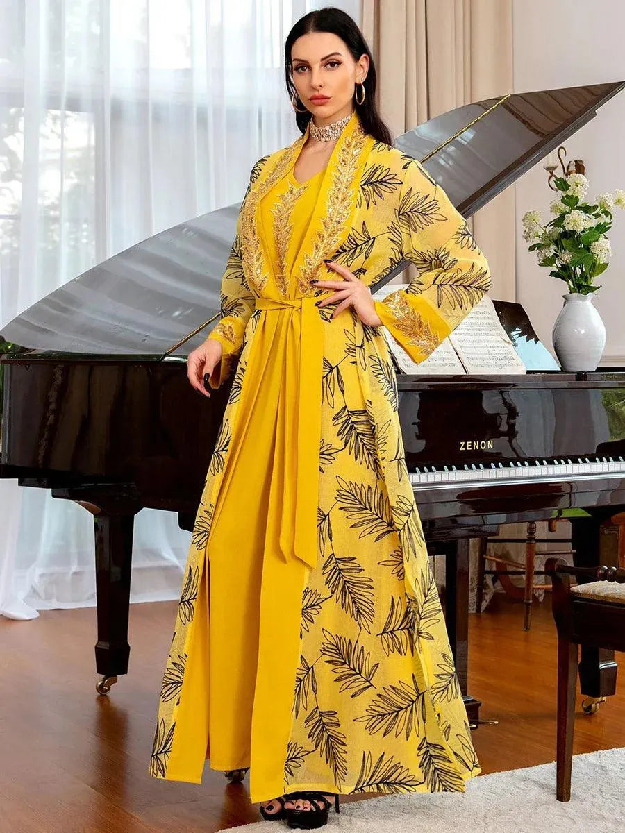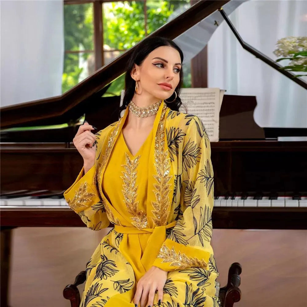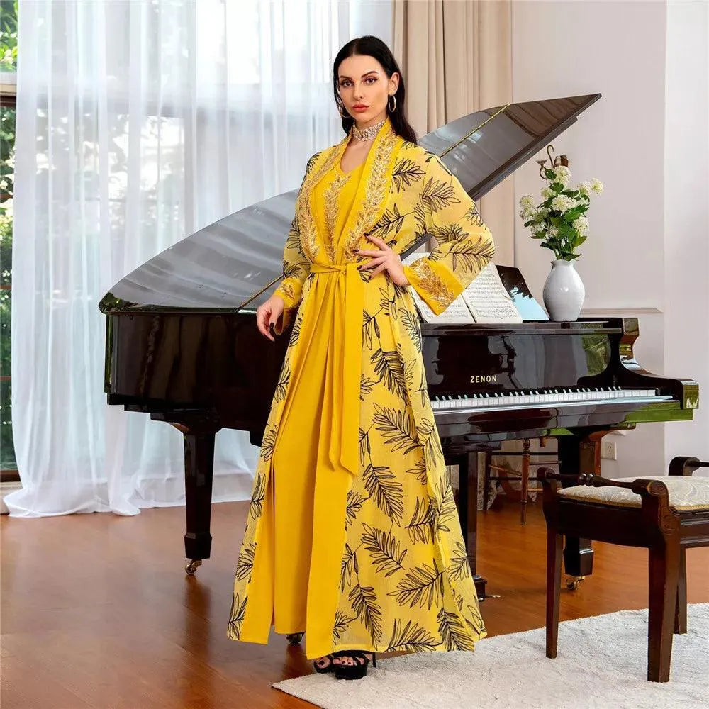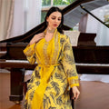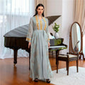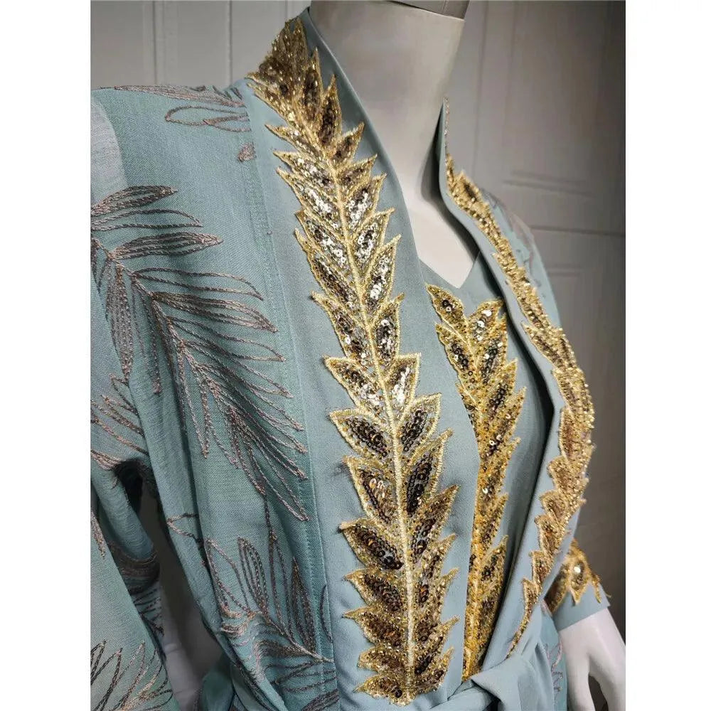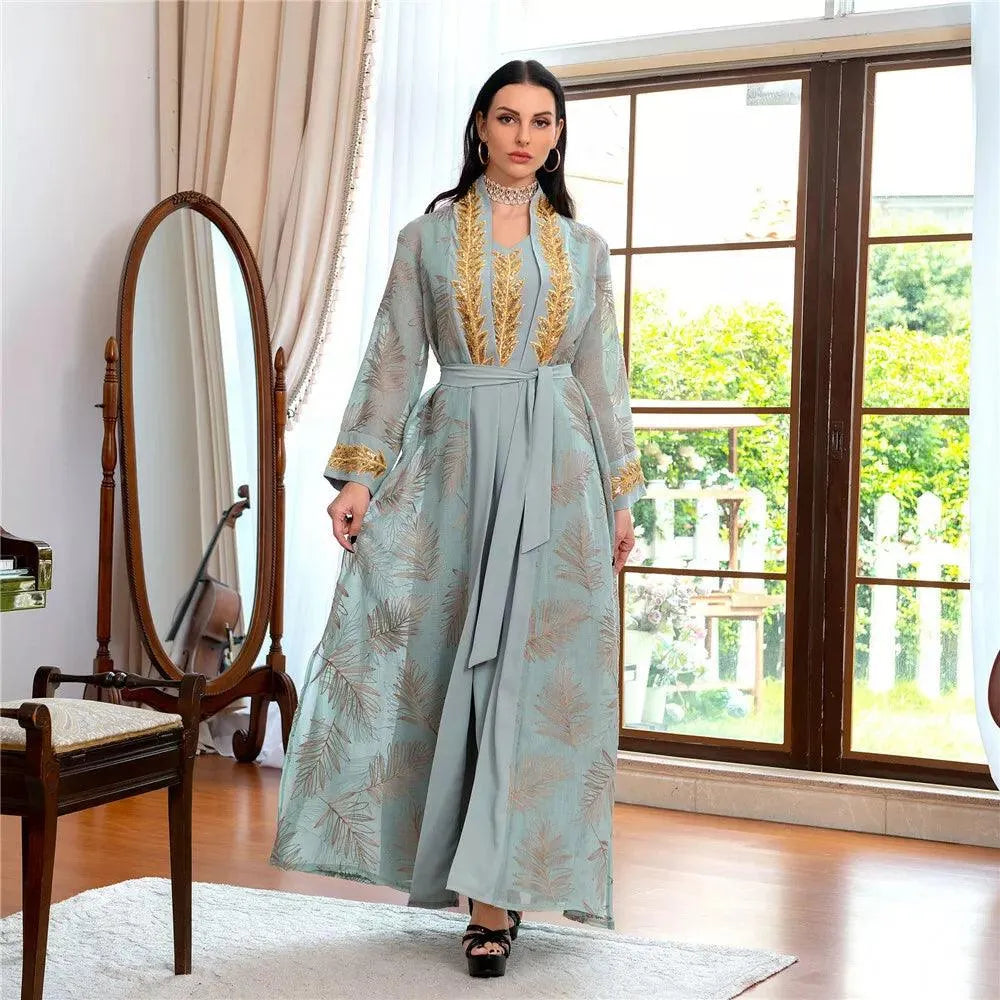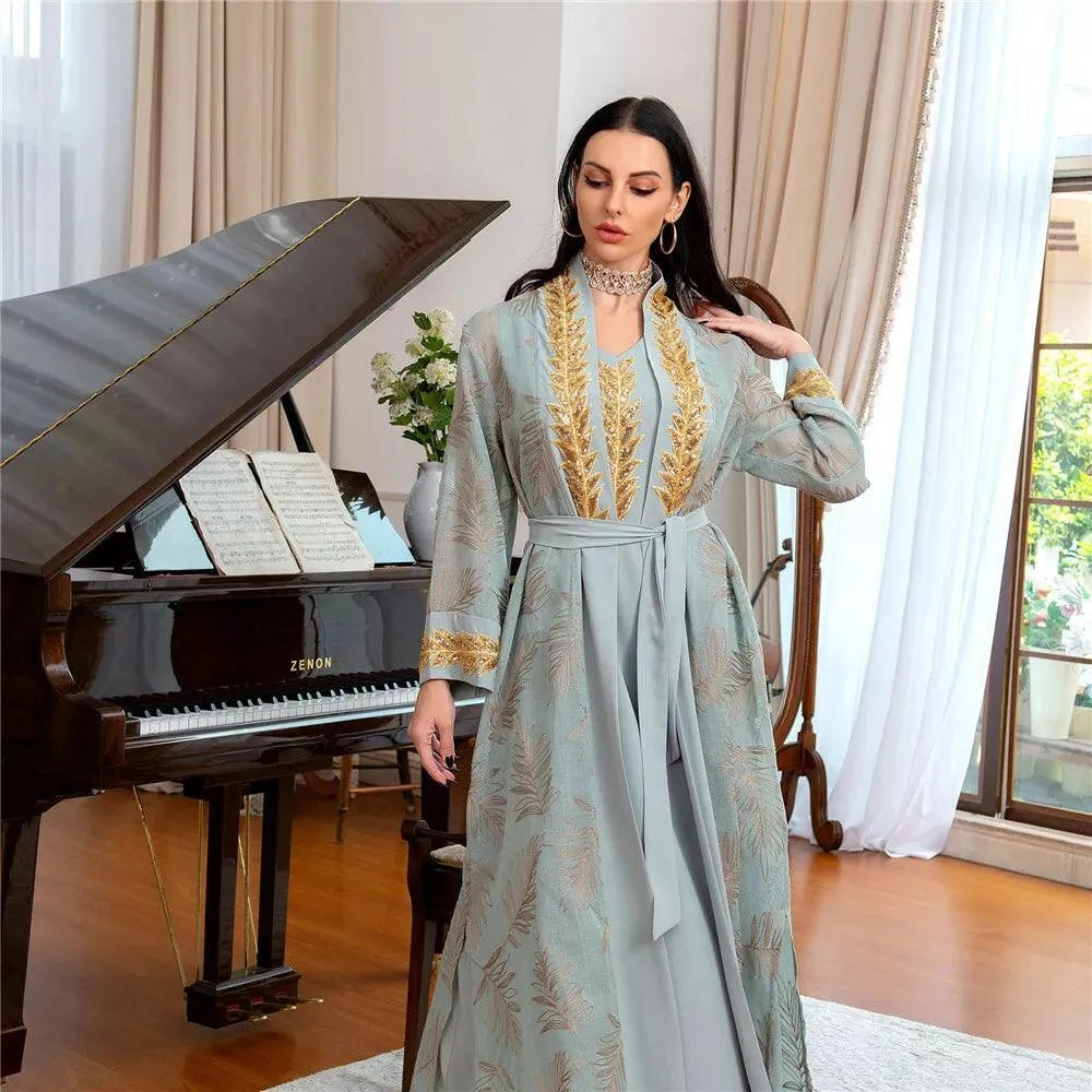 Traje de 2 piezas con bordado de guipur y encaje, escote en V, manga larga, elegante e informal con cinturón para mujeres del Golfo Islámico.