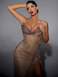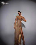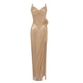 VC Flirty Glam Gold Sequin Strappless High Slit Backless Maxi Dress for Dance Party Summer Gown