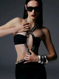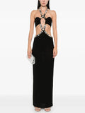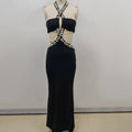 VC Sexy Halter Gold Chains Hollow Out Long Dress Black Sleeveless Backless Shiny Diamonds Bodycon Dresses Evening Party Gowns