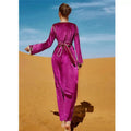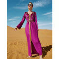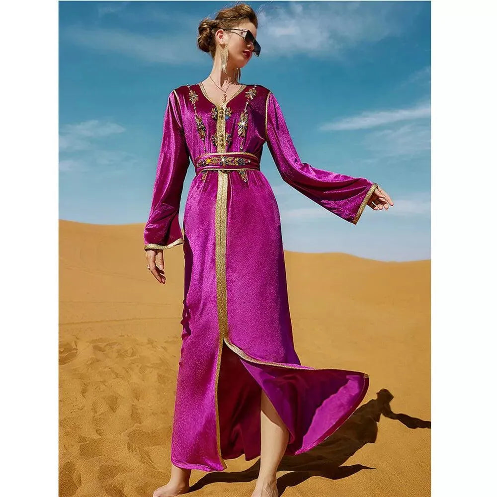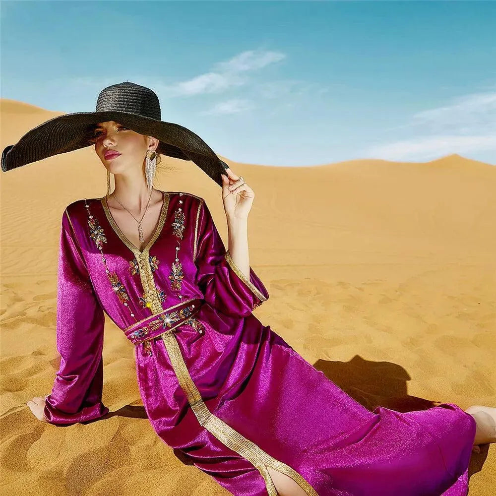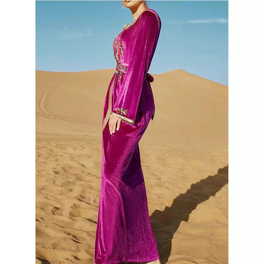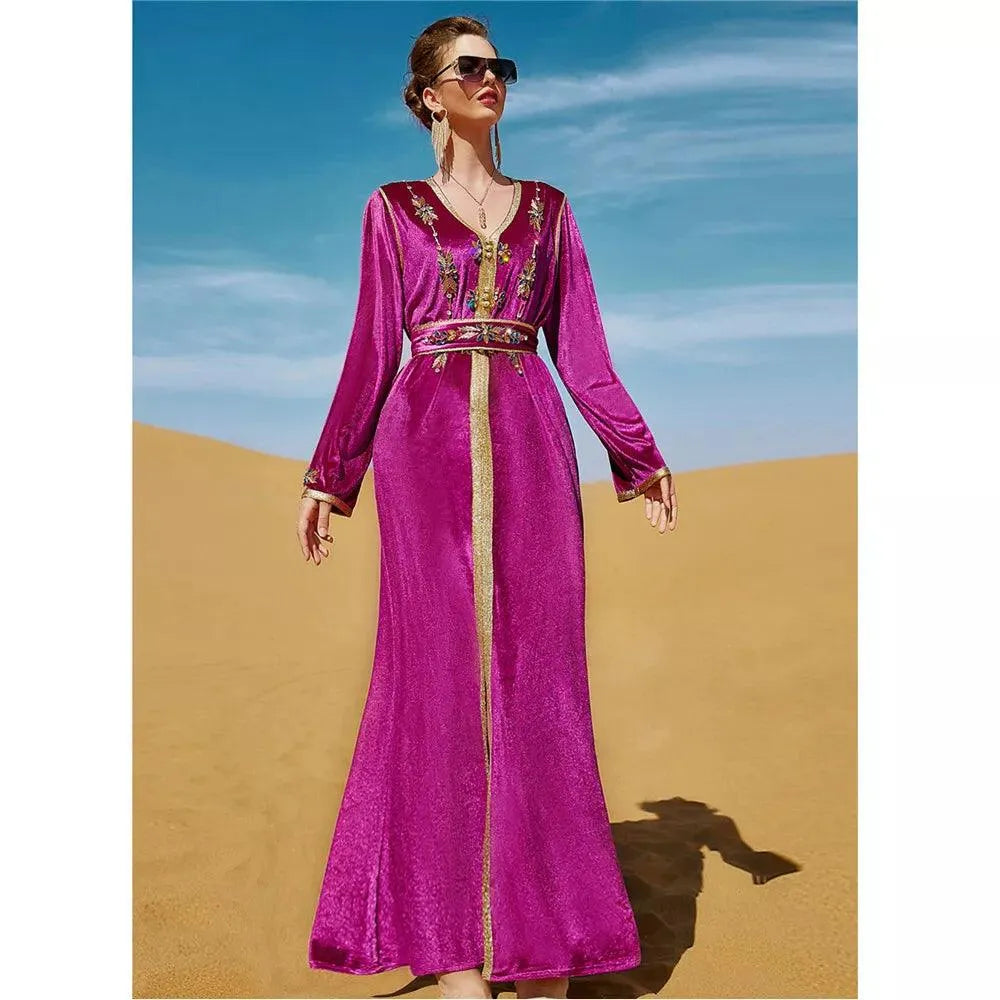 Vestido de fiesta de noche de lujo de moda, vestido de terciopelo con diamantes, manga larga, cuello en V y fajas, otoño e invierno, para mujer saudí.