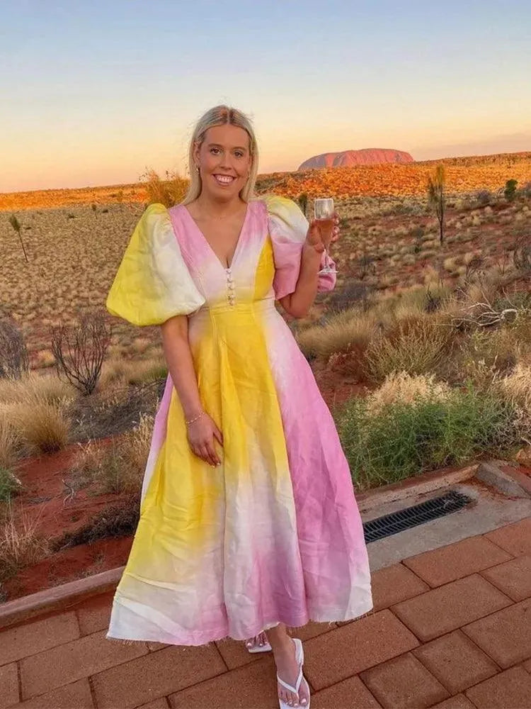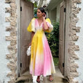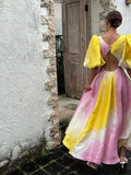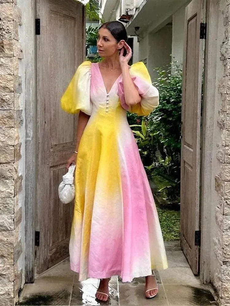 Vestido de noche arcoíris sin espalda para mujer, con escote en V, mangas cortas abullonadas, corte A, cintura alta, para invierno