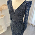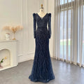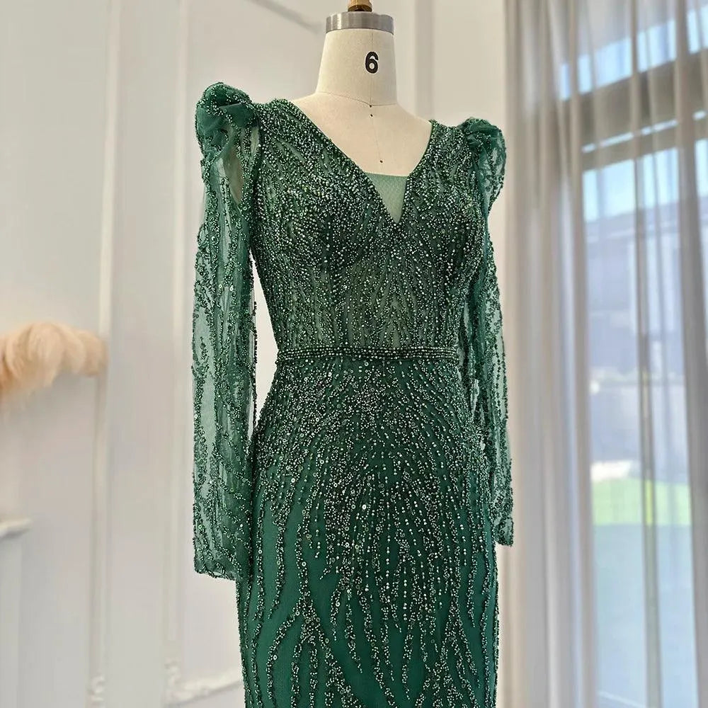 Vestido de noche de sirena azul marino para mujer, elegante vestido de fiesta formal árabe de manga larga verde esmeralda para boda.