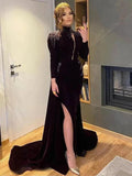 Vestido de noche estilo sirena con cuello alto y encaje negro, manga larga, estilo saudí, para fiesta, caftán con abertura lateral