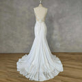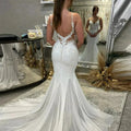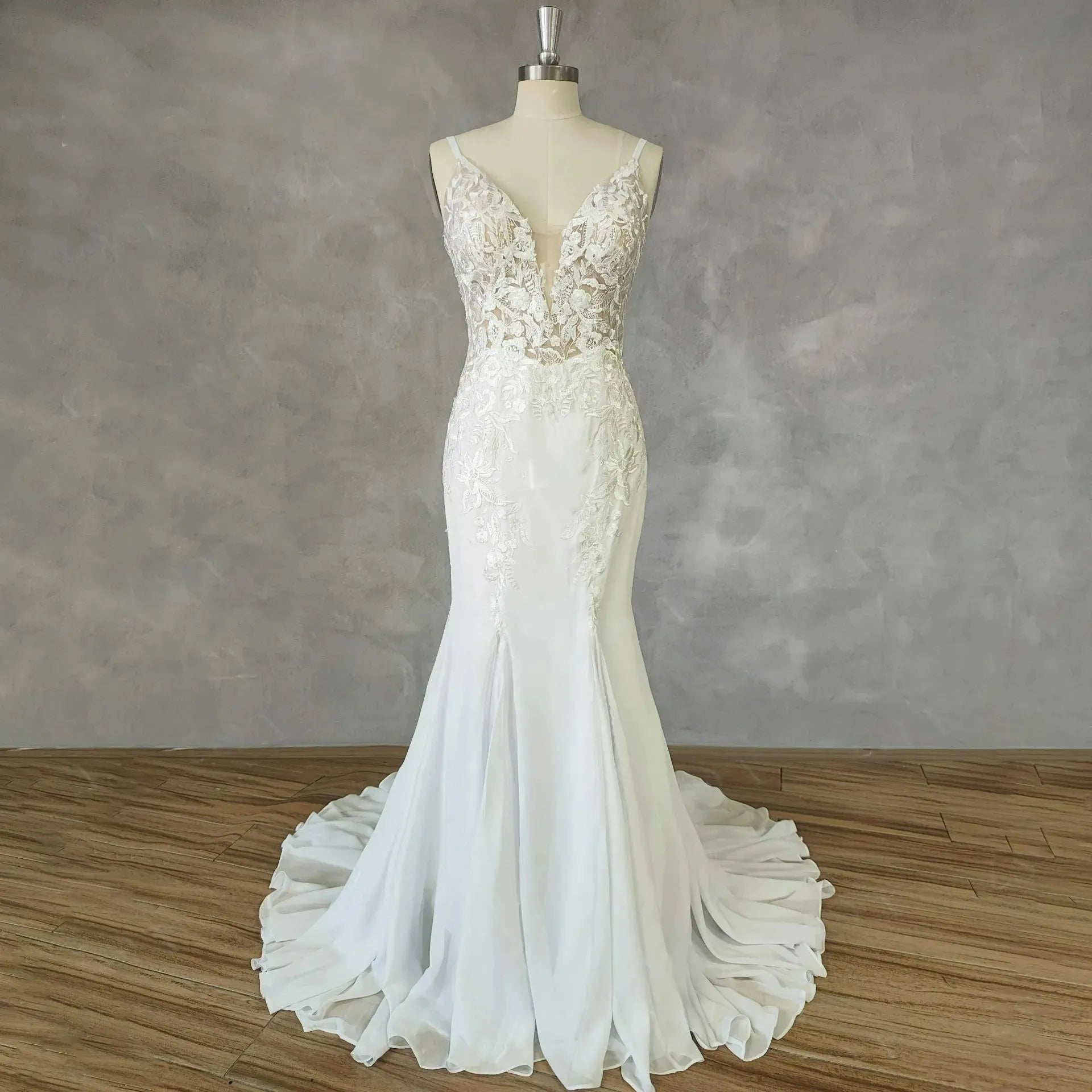 Vestido de novia LSYX de sirena de gasa sin mangas con escote en V profundo y tirantes finos sencillos, cola de corte y espalda recortada