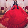 Vestido de novia rojo de manga larga, vestido de novia musulmán de encaje con apliques y cuentas, vestido de novia estilo princesa.