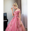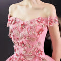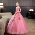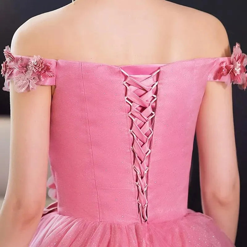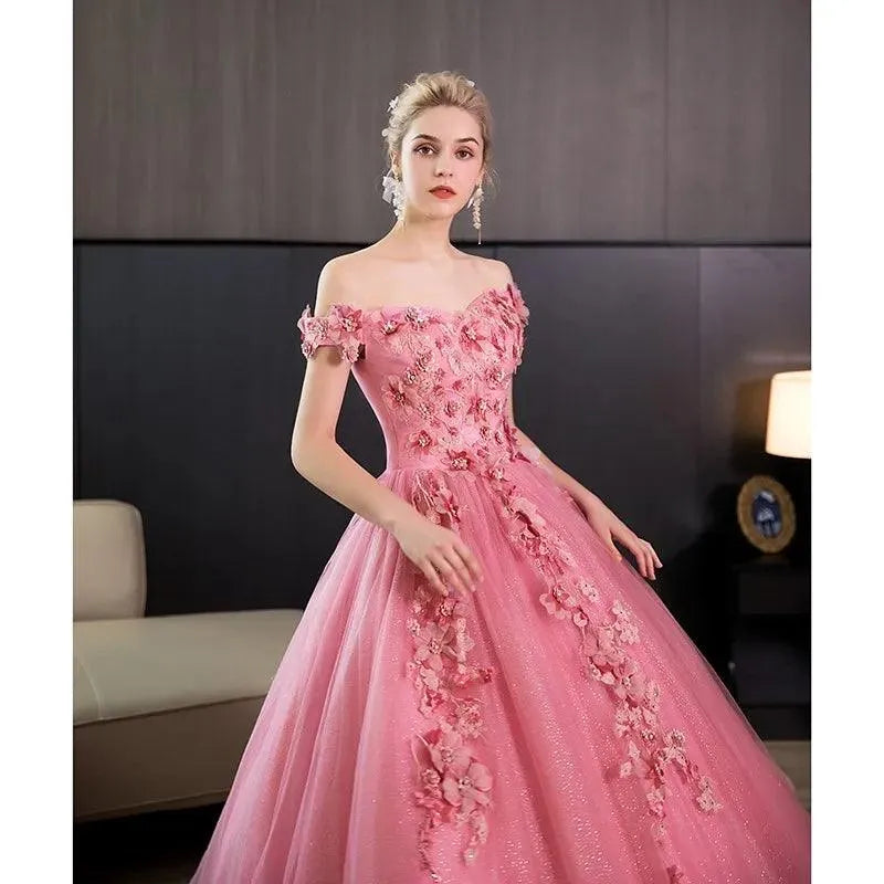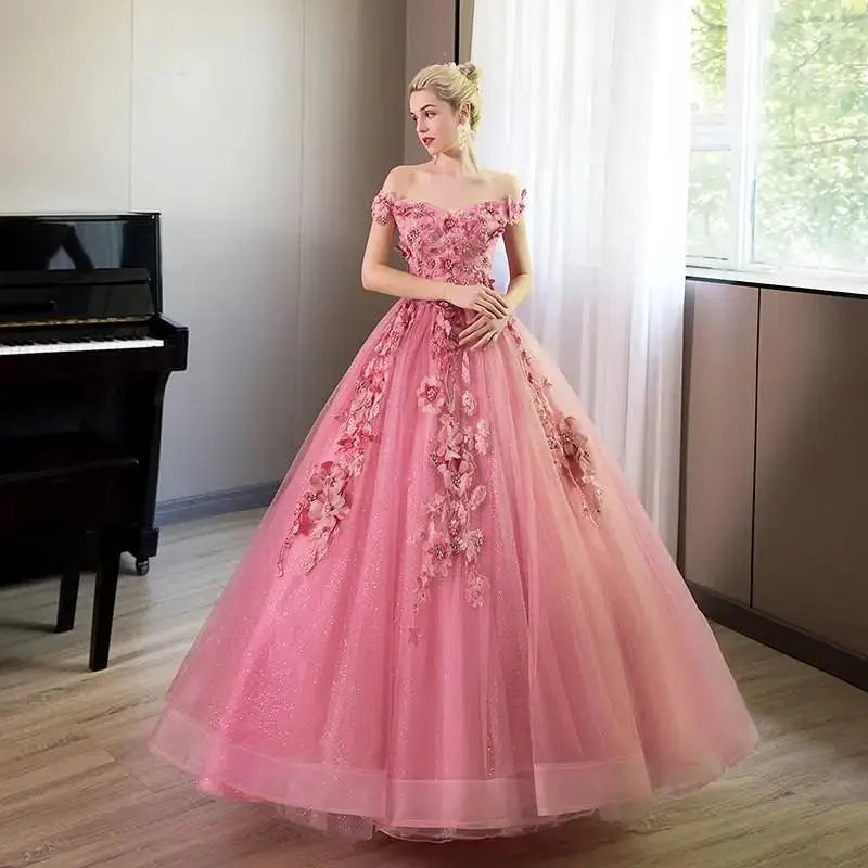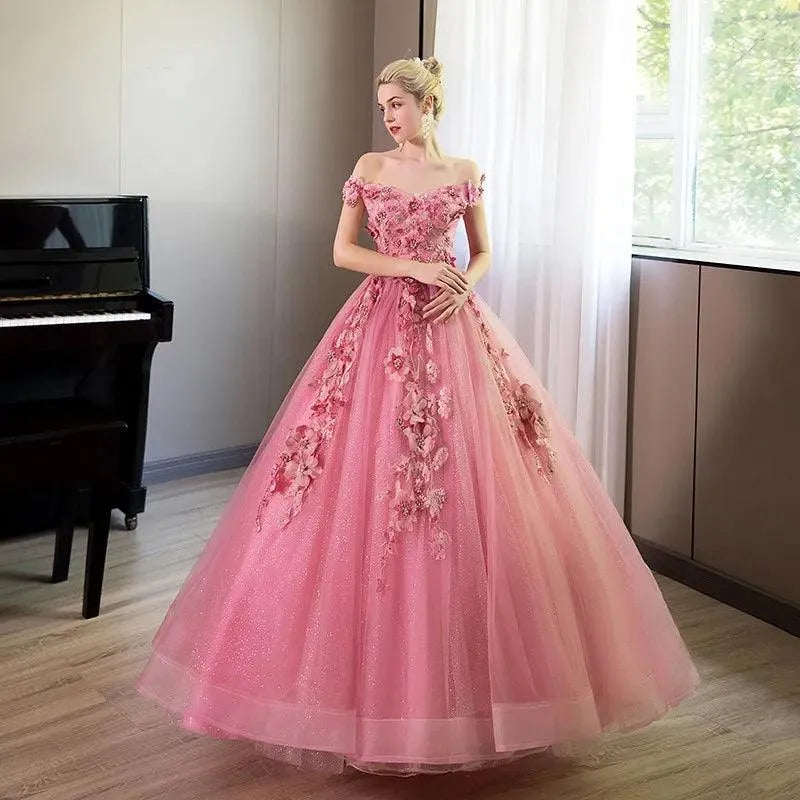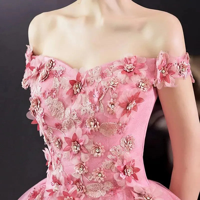 Vestido de quinceañera rosa oscuro con decoración floral de lujo y hombros descubiertos, vestidos de fiesta personalizados.