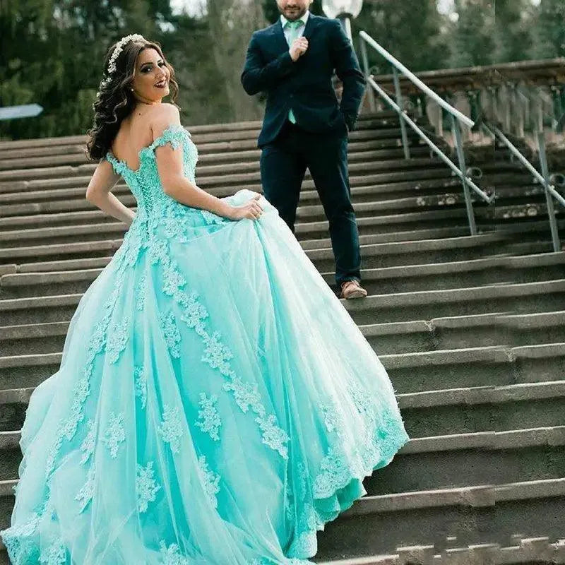Vestido de quinceañera | Vestido de baile de máscaras de moda, vestidos de quinceañera con perlas, tul, hombros descubiertos, cola larga, vestidos de novia únicos.