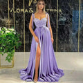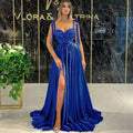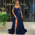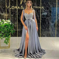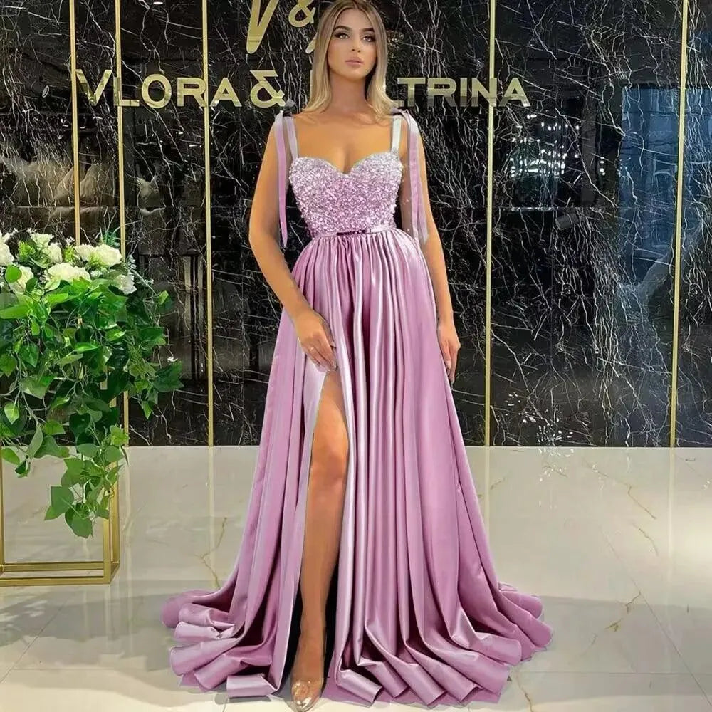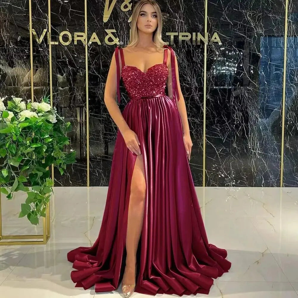 Vestidos de noche sexys personalizados con escote en forma de corazón, largos, brillantes, con lentejuelas, abertura en satén, precioso vestido de fiesta formal de línea A con tirantes