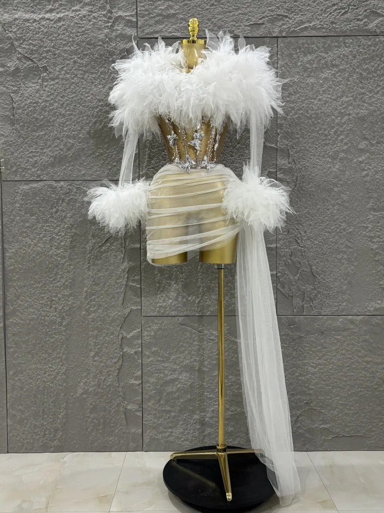 White Purple Women Sexy Mesh Ruffles 2 Pieces Bodycon Mini Dress See Through Celebrate Nightclub Party Bar Singer Stage Wear