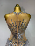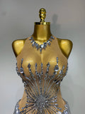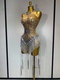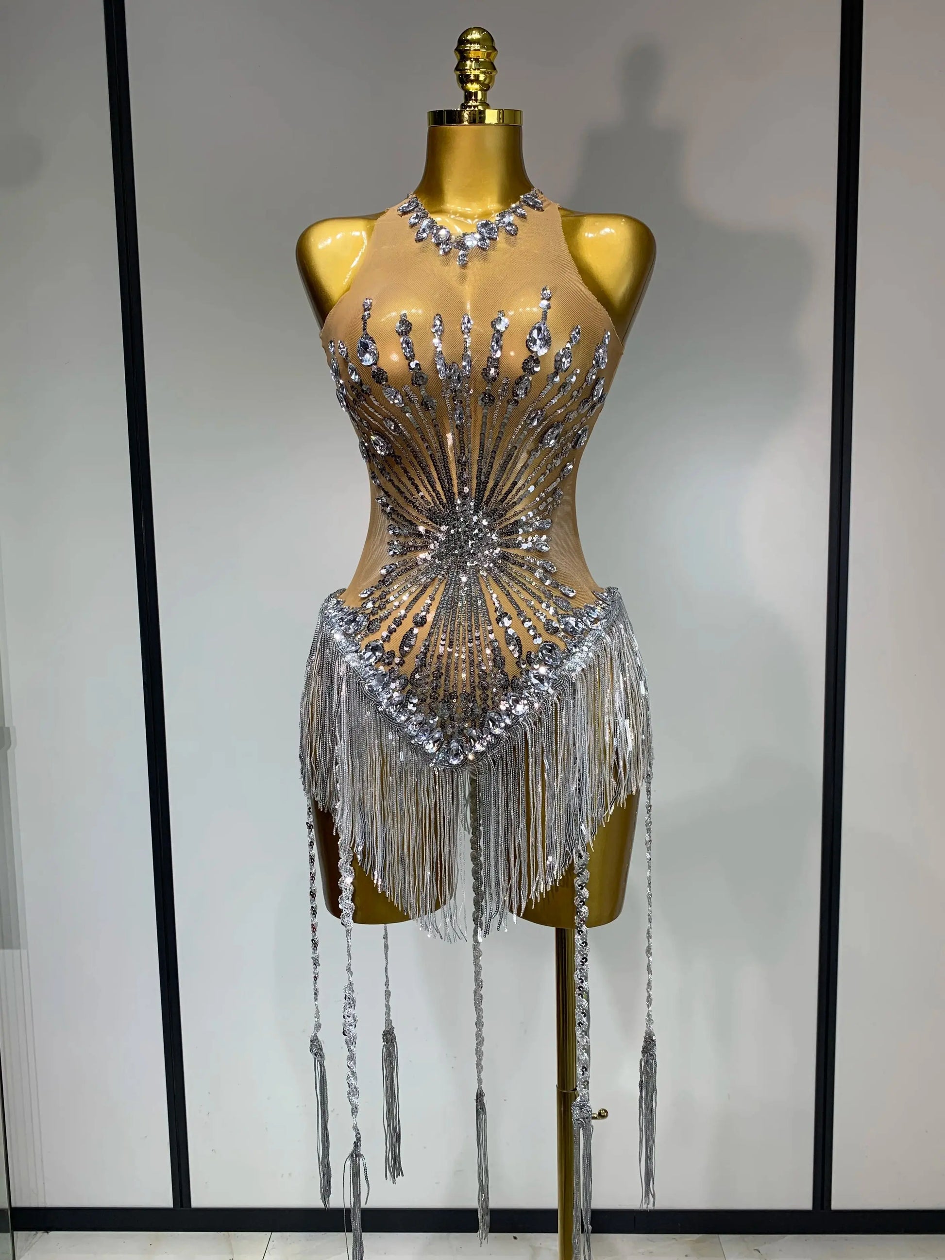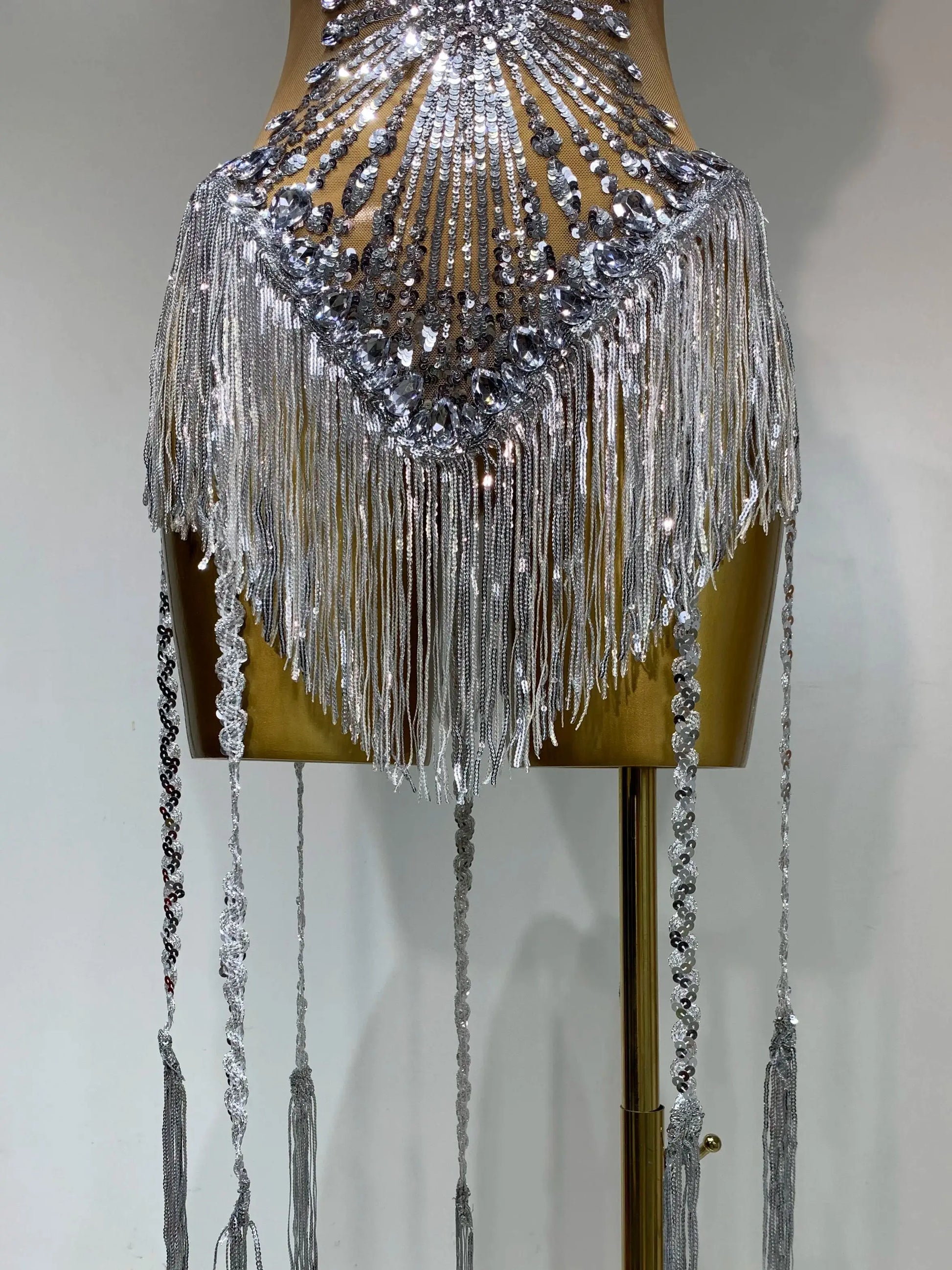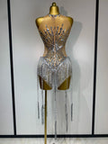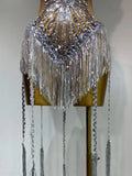 Women Sexy Mesh See Through Diamonds Long Tassels Bodysuit Luxury Evening Party Bar Nightclub Stage Performance Singer Outfit